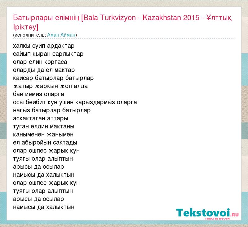 Главная→Исполнители→Аман Айман→Батырлары елімнің [Bala Turkvizyon - Kazakhstan 2015 - Ұлттық Іріктеу]