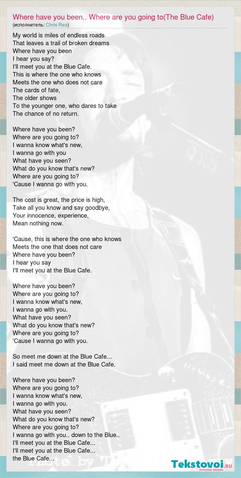 My world is miles of endless roads That leaves a trail of broken dreams Where have you been I hear you say? I'll meet you at the Blue Cafe. This is where the one who knows Meets the one who does not care The cards of fate, The older shows To the younger one, who dares to take The chance of no return. Where have you been? Where are you going to? I wanna know what's new, I wanna go with you What have you seen? What do you know that's new? Where are you going to? 'Cause I wanna go with you. The cost is great, the price is high, Take all you know and say goodbye, Your innocence, experience, Mean nothing now. 'Cause, this is where the one who knows Meets the one that does not care Where have you been? I hear you say I'll meet you at the Blue Cafe. Where have you been? Where are you going to? I wanna know what's new, I wanna go with you. What have you seen? What do you know that's new? Where are you going to? 'Cause I wanna go with you. So meet me down at the Blue Cafe... I said meet me down at the Blue Cafe. Where have you been? Where are you going to? I wanna know what's new, I wanna go with you. What have you seen? What do you know that's new? Where are you going to? I wanna go with you.. down to the Blue.. I'll meet you at the Blue Cafe... I'll meet you at the Blue Cafe... the Blue Cafe...