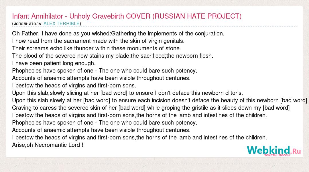 А как ты думаешь, о чем песня "Infant Annihilator - Unholy Gravebirth COVER (RUSSIAN HATE PROJECT)" ?