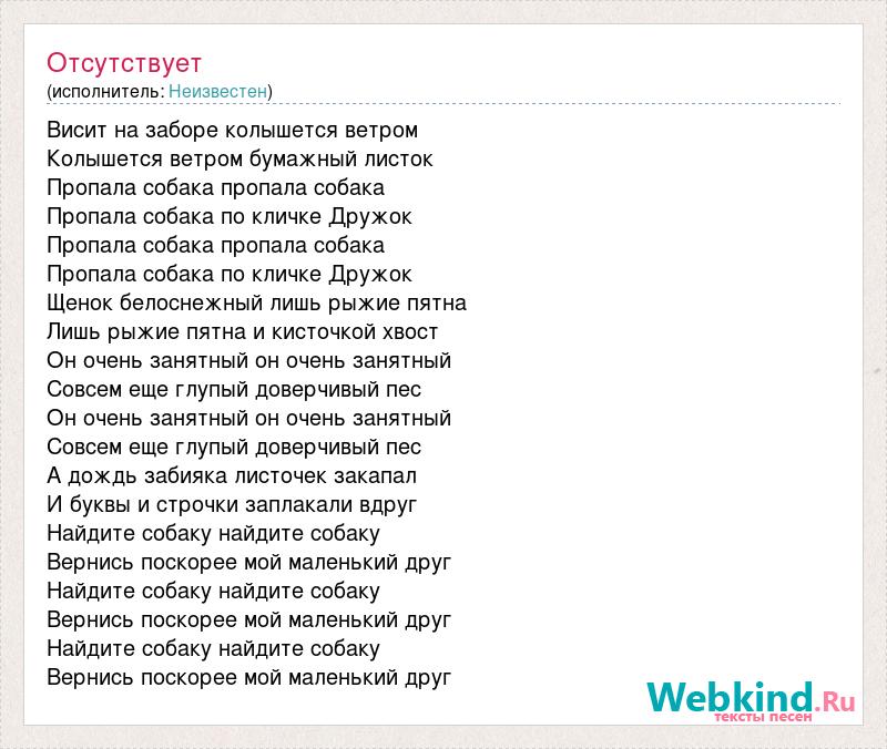 Висит на заборе колышется ветром Колышется ветром бумажный листок Пропала собака пропала собака Пропала собака по кличке Дружок Пропала собака пропала собака Пропала собака по кличке Дружок Щенок белоснежный лишь рыжие пятна Лишь рыжие пятна и кисточкой хвост Он очень занятный он очень занятный Совсем еще глупый доверчивый пес Он очень занятный он очень занятный Совсем еще глупый доверчивый пес А дождь забияка листочек закапал И буквы и строчки заплакали вдруг Найдите собаку найдите собаку Вернись поскорее мой маленький друг Найдите собаку найдите собаку Вернись поскорее мой маленький друг Найдите собаку найдите собаку Вернись поскорее мой маленький друг