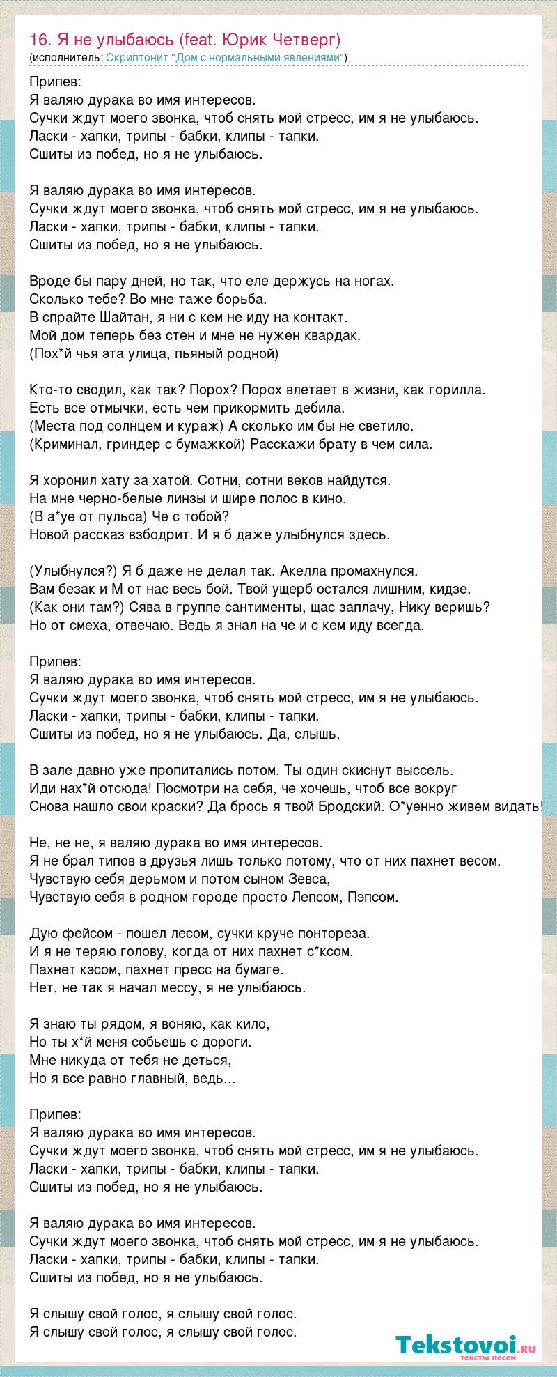 Припев: Я валяю дурака во имя интересов. Сучки ждут моего звонка, чтоб снять мой стресс, им я не улыбаюсь. Ласки - хапки, трипы - бабки, клипы - тапки. Сшиты из побед, но я не улыбаюсь. Я валяю дурака во имя интересов. Сучки ждут моего звонка, чтоб снять мой стресс, им я не улыбаюсь. Ласки - хапки, трипы - бабки, клипы - тапки. Сшиты из побед, но я не улыбаюсь. Вроде бы пару дней, но так, что еле держусь на ногах. Сколько тебе? Во мне таже борьба. В спрайте Шайтан, я ни с кем не иду на контакт. Мой дом теперь без стен и мне не нужен квардак. (Пох*й чья эта улица, пьяный родной) Кто-то сводил, как так? Порох? Порох влетает в жизни, как горилла. Есть все отмычки, есть чем прикормить дебила. (Места под солнцем и кураж) А сколько им бы не светило. (Криминал, гриндер с бумажкой) Расскажи брату в чем сила. Я хоронил хату за хатой. Сотни, сотни веков найдутся. На мне черно-белые линзы и шире полос в кино. (В а*уе от пульса) Че с тобой? Новой рассказ взбодрит. И я б даже улыбнулся здесь. (Улыбнулся?) Я б даже не делал так. Акелла промахнулся. Вам безак и М от нас весь бой. Твой ущерб остался лишним, кидзе. (Как они там?) Сява в группе сантименты, щас заплачу, Нику веришь? Но от смеха, отвечаю. Ведь я знал на че и с кем иду всегда. Припев: Я валяю дурака во имя интересов. Сучки ждут моего звонка, чтоб снять мой стресс, им я не улыбаюсь. Ласки - хапки, трипы - бабки, клипы - тапки. Сшиты из побед, но я не улыбаюсь. Да, слышь. В зале давно уже пропитались потом. Ты один скиснут выссель. Иди нах*й отсюда! Посмотри на себя, че хочешь, чтоб все вокруг Снова нашло свои краски? Да брось я твой Бродский. О*уенно живем видать! Не, не не, я валяю дурака во имя интересов. Я не брал типов в друзья лишь только потому, что от них пахнет весом. Чувствую себя дерьмом и потом сыном Зевса, Чувствую себя в родном городе просто Лепсом, Пэпсом. Дую фейсом - пошел лесом, сучки круче понтореза. И я не теряю голову, когда от них пахнет с*ксом. Пахнет кэсом, пахнет пресс на бумаге. Нет, не так я начал мессу, я не улыбаюсь. Я знаю ты рядом, я воняю, как кило, Но ты х*й меня собьешь с дороги. Мне никуда от тебя не деться, Но я все равно главный, ведь... Припев: Я валяю дурака во имя интересов. Сучки ждут моего звонка, чтоб снять мой стресс, им я не улыбаюсь. Ласки - хапки, трипы - бабки, клипы - тапки. Сшиты из побед, но я не улыбаюсь. Я валяю дурака во имя интересов. Сучки ждут моего звонка, чтоб снять мой стресс, им я не улыбаюсь. Ласки - хапки, трипы - бабки, клипы - тапки. Сшиты из побед, но я не улыбаюсь. Я слышу свой голос, я слышу свой голос. Я слышу свой голос, я слышу свой голос.