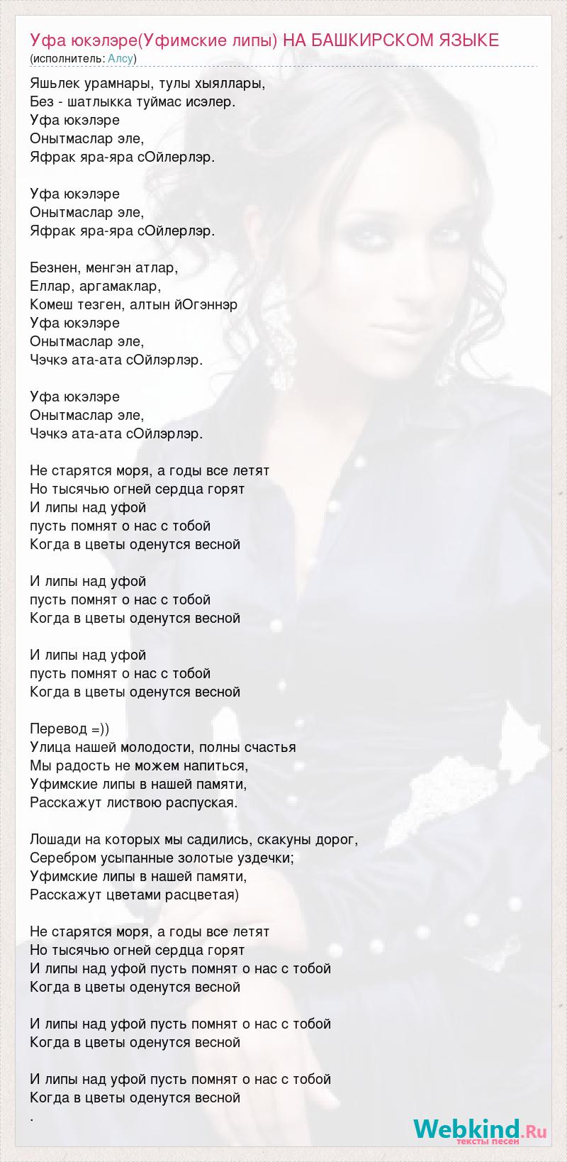 Яшьлек урамнары, тулы хыяллары, Без - шатлыкка туймас исэлер. Уфа юкэлэре Онытмаслар эле, Яфрак яра-яра сOйлерлэр. Уфа юкэлэре Онытмаслар эле, Яфрак яра-яра сOйлерлэр. Безнен, менгэн атлар, Еллар, аргамаклар, Комеш тезген, алтын йOгэннэр Уфа юкэлэре Онытмаслар эле, Чэчкэ ата-ата сOйлэрлэр. Уфа юкэлэре Онытмаслар эле, Чэчкэ ата-ата сOйлэрлэр. Не старятся моря, а годы все летят Но тысячью огней сердца горят И липы над уфой пусть помнят о нас с тобой Когда в цветы оденутся весной И липы над уфой пусть помнят о нас с тобой Когда в цветы оденутся весной И липы над уфой пусть помнят о нас с тобой Когда в цветы оденутся весной Перевод =)) Улица нашей молодости, полны счастья Мы радость не можем напиться, Уфимские липы в нашей памяти, Расскажут листвою распуская. Лошади на которых мы садились, скакуны дорог, Серебром усыпанные золотые уздечки; Уфимские липы в нашей памяти, Расскажут цветами расцветая) Не старятся моря, а годы все летят Но тысячью огней сердца горят И липы над уфой пусть помнят о нас с тобой Когда в цветы оденутся весной И липы над уфой пусть помнят о нас с тобой Когда в цветы оденутся весной И липы над уфой пусть помнят о нас с тобой Когда в цветы оденутся весной .