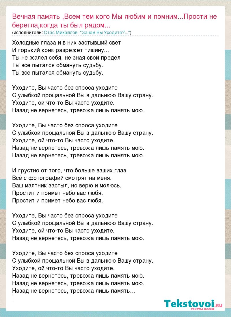 Главная→Исполнители→Стас Михайлов -"Зачем Вы Уходите?..."→Вечная память ,Всем тем кого Мы любим и помним...Прости не берегла,ког