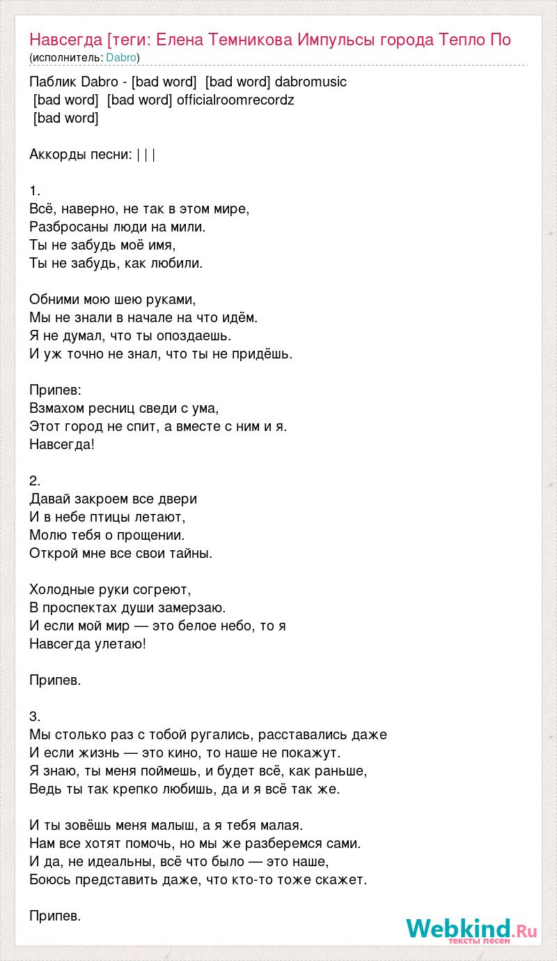 Паблик Dabro - [bad word] [bad word] dabromusic [bad word] [bad word] officialroomrecordz [bad word] Аккорды песни: | | | 1. Всё, наверно, не так в этом мире, Разбросаны люди на мили. Ты не забудь моё имя, Ты не забудь, как любили. Обними мою шею руками, Мы не знали в начале на что идём. Я не думал, что ты опоздаешь. И уж точно не знал, что ты не придёшь. Припев: Взмахом ресниц сведи с ума, Этот город не спит, а вместе с ним и я. Навсегда! 2. Давай закроем все двери И в небе птицы летают, Молю тебя о прощении. Открой мне все свои тайны. Холодные руки согреют, В проспектах души замерзаю. И если мой мир — это белое небо, то я Навсегда улетаю! Припев. 3. Мы столько раз с тобой ругались, расставались даже И если жизнь — это кино, то наше не покажут. Я знаю, ты меня поймешь, и будет всё, как раньше, Ведь ты так крепко любишь, да и я всё так же. И ты зовёшь меня малыш, а я тебя малая. Нам все хотят помочь, но мы же разберемся сами. И да, не идеальны, всё что было — это наше, Боюсь представить даже, что кто-то тоже скажет. Припев.