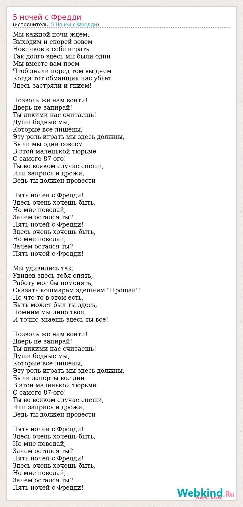 Мы каждой ночи ждем, Выходим и скорей зовем Новичков к себе играть Так долго здесь мы были одни Мы вместе вам поем Чтоб знали перед тем вы днем Когда тот обманщик нас убьет Здесь застряли и гнием! Позволь же нам войти! Дверь не запирай! Ты дикими нас считаешь! Души бедные мы, Которые все лишены, Эту роль играть мы здесь должны, Были мы одни совсем В этой маленькой тюрьме С самого 87-ого! Ты во всяком случае спеши, Или запрись и дрожи, Ведь ты должен провести Пять ночей с Фредди! Здесь очень хочешь быть, Но мне поведай, Зачем остался ты? Пять ночей с Фредди! Здесь очень хочешь быть, Но мне поведай, Зачем остался ты? Пять ночей с Фредди! Мы удивились так, Увидев здесь тебя опять, Работу мог бы поменять, Сказать кошмарам здешним "Прощай"! Но что-то в этом есть, Быть может был ты здесь, Помним мы лицо твое, И точно знаешь здесь ты все! Позволь же нам войти! Дверь не запирай! Ты дикими нас считаешь! Души бедные мы, Которые все лишены, Эту роль играть мы здесь должны, Были заперты все дни В этой маленькой тюрьме С самого 87-ого! Ты во всяком случае спеши, Или запрись и дрожи, Ведь ты должен провести Пять ночей с Фредди! Здесь очень хочешь быть, Но мне поведай, Зачем остался ты? Пять ночей с Фредди! Здесь очень хочешь быть, Но мне поведай, Зачем остался ты? Пять ночей с Фредди!