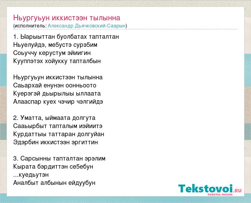1. Ыарыыттан буолбатах тапталтан Ньуелуйдэ, ме5устэ сурэ5им Соьуччу керустум эйиигин Кууппэтэх хойукку тапталбын Ньургуьун иккистээн тылынна Саьархай енунэн оонньоото Куерэгэй дьырылыы ыллаата Алааспар куех чэчир чэлгийдэ 2. Уматта, ыймаата долгута Сааьырбыт тапталым иэйиитэ Курдаттыы таттаран долгуйан Эдэрбин иккистээн эргиттин 3. Сарсынны тапталтан эрэлим Кырата бэрдиттэн се5ебун ...куедьутэн Аналбыт албынын ейдуубун