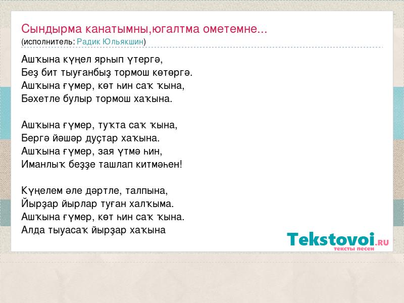 Ашҡына күңел ярһып үтергә, Беҙ бит тыуғанбыҙ тормош көтөргә. Ашҡына ғүмер, көт һин саҡ ҡына, Бәхетле булыр тормош хаҡына. Ашҡына ғүмер, туҡта саҡ ҡына, Бергә йәшәр дуҫтар хаҡына. Ашҡына ғүмер, зая үтмә һин, Иманлыҡ беҙҙе ташлап китмәһен! Күңелем әле дәртле, талпына, Йырҙар йырлар туған халҡыма. Ашҡына ғүмер, көт һин саҡ ҡына. Алда тыуасаҡ йырҙар хаҡына