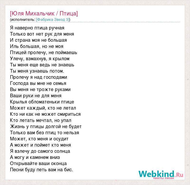 Я наверно птица ручная Только вот нет рук для меня И страна моя не большая Иль большая, но не моя Птицей пролечу, не поймаешь Улечу, взмахнув, я крылом Ты меня еще ведь не знаешь Ты меня узнаешь потом. Пролечу я над господами Господа вы мне не семья Вы меня не трожте руками Ваши руки не для меня Крылья обломатеньки птице Может каждый, кто не летал Кто ни как не может смириться Кто летать мечтал, но упал Жизнь у птицы долгой не будет Только вам без птиц то нельзя Может, кто меня и осудит А может и поймет кто меня Я взлечу до самого солнца А могу и каменем вниз Открывайте ваши оконца Песни буду петь вам на бис.