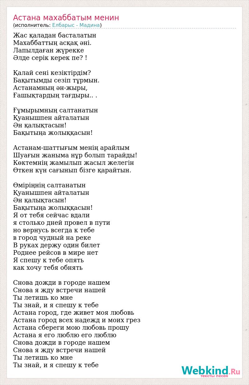 Жас қаладан басталатын Махаббаттың асқақ әні. Лапылдаған жүрекке Әлде серік керек пе? ! Қалай сені кезіктірдім? Бақытымды сезіп тұрмын. Астанамның ән-жыры, Ғашықтардың тағдыры.. . Ғұмырымның салтанатын Қуанышпен айталатын Ән қалықтасын! Бақытыңа жолыққасын! Астанам-шаттығым менің арайлым Шуағын жаныма нұр болып тарайды! Көктемнің жамылып жасыл желегін Өткен күн сағынып бізге қарайтын. Өміріңнің салтанатын Қуанышпен айталатын Ән қалықтасын! Бақытыңа жолыққасын! Я от тебя сейчас вдали я столько дней провел в пути но вернусь всегда к тебе в город чудный на реке В руках держу один билет Роднее рейсов в мире нет Я спешу к тебе опять как хочу тебя обнять Снова дожди в городе нашем Снова я жду встречи нашей Ты летишь ко мне Ты знай, и я спешу к тебе Астана город, где живет моя любовь Астана город всех надежд и моих грез Астана сбереги мою любовь прошу Астана я его люблю его люблю Снова дожди в городе нашем Снова я жду встречи нашей Ты летишь ко мне Ты знай, и я спешу к тебе