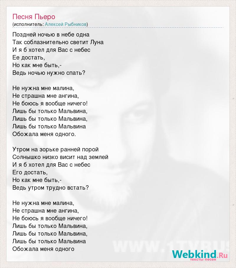 Поздней ночью в небе одна Так соблазнительно светит Луна И я б хотел для Вас с небес Ее достать, Но как мне быть,- Ведь ночью нужно спать? Не нужна мне малина, Не страшна мне ангина, Не боюсь я вообще ничего! Лишь бы только Мальвина, Лишь бы только Мальвина, Лишь бы только Мальвина Обожала меня одного. Утром на зорьке ранней порой Солнышко низко висит над землей И я б хотел для Вас с небес Его достать, Но как мне быть,- Ведь утром трудно встать? Не нужна мне малина, Не страшна мне ангина, Не боюсь я вообще ничего! Лишь бы только Мальвина, Лишь бы только Мальвина, Лишь бы только Мальвина Обожала меня одного