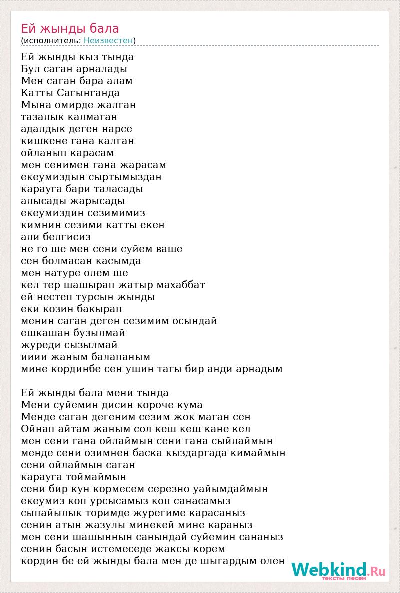 Ей жынды кыз тында Бул саган арналады Мен саган бара алам Катты Сагынганда Мына омирде жалган тазалык калмаган адалдык деген нарсе кишкене гана калган ойланып карасам мен сенимен гана жарасам екеумиздын сыртымыздан карауга бари таласады алысады жарысады екеумиздин сезимимиз кимнин сезими катты екен али белгисиз не го ше мен сени суйем ваше сен болмасан касымда мен натуре олем ше кел тер шашырап жатыр махаббат ей нестеп турсын жынды еки козин бакырап менин саган деген сезимим осындай ешкашан бузылмай журеди сызылмай ииии жаным балапаным мине кординбе сен ушин тагы бир анди арнадым Ей жынды бала мени тында Мени суйемин дисин короче кума Менде саган дегеним сезим жок маган сен Ойнап айтам жаным сол кеш кеш кане кел мен сени гана ойлаймын сени гана сыйлаймын менде сени озимнен баска кыздаргада кимаймын сени ойлаймын саган карауга тоймаймын сени бир кун кормесем серезно уайымдаймын екеумиз коп урсысамыз коп санасамыз сыпайылык торимде журегиме карасаныз сенин атын жазулы минекей мине караныз мен сени шашыннын санындай суйемин сананыз сенин басын истемеседе жаксы корем кордин бе ей жынды бала мен де шыгардым олен