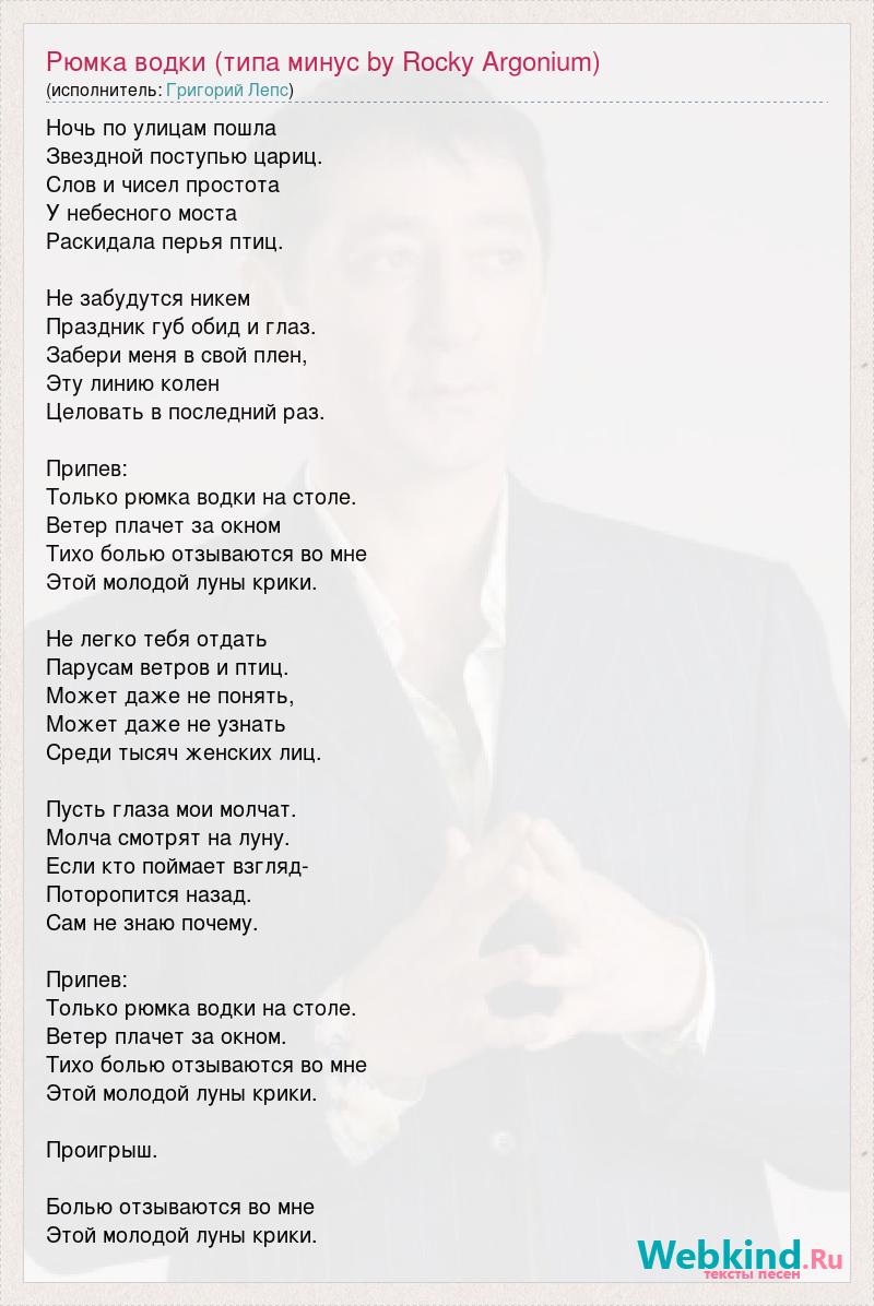 Ночь по улицам пошла Звездной поступью цариц. Слов и чисел простота У небесного моста Раскидала перья птиц. Не забудутся никем Праздник губ обид и глаз. Забери меня в свой плен, Эту линию колен Целовать в последний раз. Припев: Только рюмка водки на столе. Ветер плачет за окном Тихо болью отзываются во мне Этой молодой луны крики. Не легко тебя отдать Парусам ветров и птиц. Может даже не понять, Может даже не узнать Среди тысяч женских лиц. Пусть глаза мои молчат. Молча смотрят на луну. Если кто поймает взгляд- Поторопится назад. Сам не знаю почему. Припев: Только рюмка водки на столе. Ветер плачет за окном. Тихо болью отзываются во мне Этой молодой луны крики. Проигрыш. Болью отзываются во мне Этой молодой луны крики.