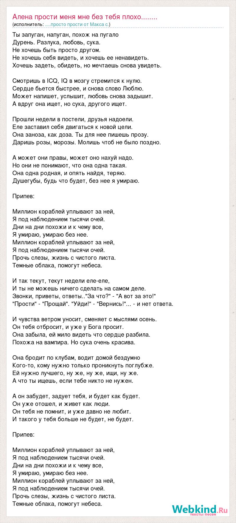 А как ты думаешь, о чем песня "Алена прости меня мне без тебя плохо........" ?