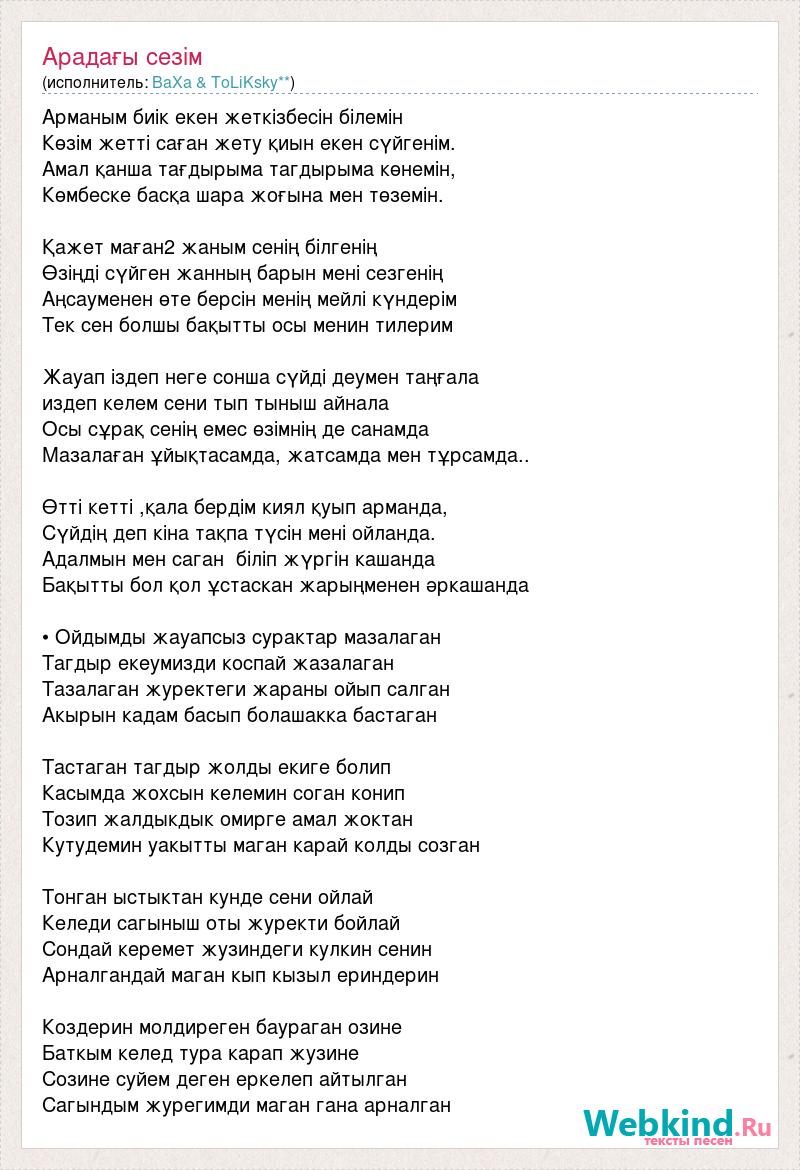 Арманым биік екен жеткізбесін білемін Көзім жетті саған жету қиын екен сүйгенім. Амал қанша тағдырыма тагдырыма көнемін, Көмбеске басқа шара жоғына мен төземін. Қажет маған2 жаным сенің білгенің Өзіңді сүйген жанның барын мені сезгенің Аңсауменен өте берсін менің мейлі күндерім Тек сен болшы бақытты осы менин тилерим Жауап іздеп неге сонша сүйді деумен таңғала издеп келем сени тып тыныш айнала Осы сұрақ сенің емес өзімнің де санамда Мазалаған ұйықтасамда, жатсамда мен тұрсамда.. Өтті кеттi ,қала бердiм киял қуып арманда, Сүйдің деп кіна тақпа түсін мені ойланда. Адалмын мен саган біліп жүргін кашанда Бақытты бол қол ұстаскан жарыңменен әркашанда • Ойдымды жауапсыз сурактар мазалаган Тагдыр екеумизди коспай жазалаган Тазалаган журектеги жараны ойып салган Акырын кадам басып болашакка бастаган Тастаган тагдыр жолды екиге болип Касымда жохсын келемин соган конип Тозип жалдыкдык омирге амал жоктан Кутудемин уакытты маган карай колды созган Тонган ыстыктан кунде сени ойлай Келеди сагыныш оты журекти бойлай Сондай керемет жузиндеги кулкин сенин Арналгандай маган кып кызыл ериндерин Коздерин молдиреген баураган озине Баткым келед тура карап жузине Созине суйем деген еркелеп айтылган Сагындым журегимди маган гана арналган