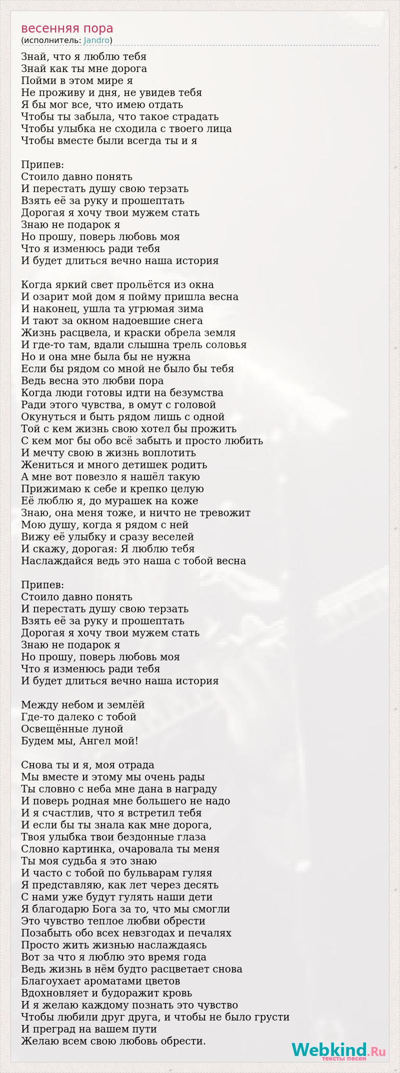 Знай, что я люблю тебя Знай как ты мне дорога Пойми в этом мире я Не проживу и дня, не увидев тебя Я бы мог все, что имею отдать Чтобы ты забыла, что такое страдать Чтобы улыбка не сходила с твоего лица Чтобы вместе были всегда ты и я Припев: Стоило давно понять И перестать душу свою терзать Взять её за руку и прошептать Дорогая я хочу твои мужем стать Знаю не подарок я Но прошу, поверь любовь моя Что я изменюсь ради тебя И будет длиться вечно наша история Когда яркий свет прольётся из окна И озарит мой дом я пойму пришла весна И наконец, ушла та угрюмая зима И тают за окном надоевшие снега Жизнь расцвела, и краски обрела земля И где-то там, вдали слышна трель соловья Но и она мне была бы не нужна Если бы рядом со мной не было бы тебя Ведь весна это любви пора Когда люди готовы идти на безумства Ради этого чувства, в омут с головой Окунуться и быть рядом лишь с одной Той с кем жизнь свою хотел бы прожить С кем мог бы обо всё забыть и просто любить И мечту свою в жизнь воплотить Жениться и много детишек родить А мне вот повезло я нашёл такую Прижимаю к себе и крепко целую Её люблю я, до мурашек на коже Знаю, она меня тоже, и ничто не тревожит Мою душу, когда я рядом с ней Вижу её улыбку и сразу веселей И скажу, дорогая: Я люблю тебя Наслаждайся ведь это наша с тобой весна Припев: Стоило давно понять И перестать душу свою терзать Взять её за руку и прошептать Дорогая я хочу твои мужем стать Знаю не подарок я Но прошу, поверь любовь моя Что я изменюсь ради тебя И будет длиться вечно наша история Между небом и землёй Где-то далеко с тобой Освещённые луной Будем мы, Ангел мой! Снова ты и я, моя отрада Мы вместе и этому мы очень рады Ты словно с неба мне дана в награду И поверь родная мне большего не надо И я счастлив, что я встретил тебя И если бы ты знала как мне дорога, Твоя улыбка твои бездонные глаза Словно картинка, очаровала ты меня Ты моя судьба я это знаю И часто с тобой по бульварам гуляя Я представляю, как лет через десять С нами уже будут гулять наши дети Я благодарю Бога за то, что мы смогли Это чувство теплое любви обрести Позабыть обо всех невзгодах и печалях Просто жить жизнью наслаждаясь Вот за что я люблю это время года Ведь жизнь в нём будто расцветает снова Благоухает ароматами цветов Вдохновляет и будоражит кровь И я желаю каждому познать это чувство Чтобы любили друг друга, и чтобы не было грусти И преград на вашем пути Желаю всем свою любовь обрести.