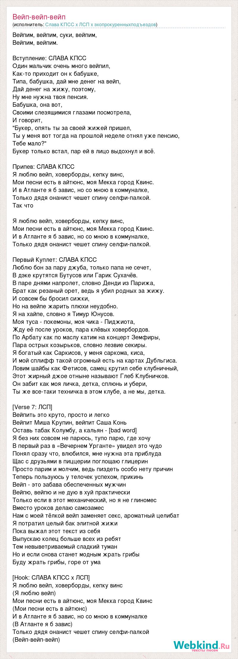 Вейпим, вейпим, суки, вейпим, Вейпим, вейпим. Вступление: СЛАВА КПСС Один мальчик очень много вейпил, Как-то приходит он к бабушке, Типа, бабушка, дай мне денег на вейп, Дай денег на жижу, поэтому, Ну мне нужна твоя пенсия. Бабушка, она вот, Своими слезящимися глазами посмотрела, И говорит, "Букер, опять ты за своей жижей пришел, Ты у меня вот тогда на прошлой неделе отнял уже пенсию, Тебе мало?" Букер только встал, пар ей в лицо выдохнул и всё. Припев: СЛАВА КПСС Я люблю вейп, ховерборды, кепку винс, Мои песни есть в айтюнс, моя Мекка город Квинс. И в Атланте я б завис, но со мною в коммуналке, Только дядя онанист чешет спину селфи-палкой. Так что Я люблю вейп, ховерборды, кепку винс, Мои песни есть в айтюнс, моя Мекка город Квинс. И в Атланте я б завис, но со мною в коммуналке, Только дядя онанист чешет спину селфи-палкой. Первый Куплет: СЛАВА КПСС Люблю бон за пару джуба, только папа не сечет, В дэке крутятся Бутусов или Гарик Сухачёв. В паре днями напролет, словно Денди из Парижа, Брат как резаный орет, ведь я убил родных за жижу. И совсем бы бросил сижки, Но на вейпе жарить плюхи неудобно. Я на хайпе, словно я Тимур Юнусов. Моя туса - покемоны, моя чика - Пиджиота, Жду её после уроков, пара клёвых ховербордов. По Арбату как по маслу катим на концерт Земфиры, Пара острых козырьков, словно лезвие секиры. Я богатый как Саркисов, у меня саркома, киса, И мой сплифф такой огромный есть на картах Дубльгиса. Ловим шайбы как Фетисов, самец крутил себе клубничный, Этот жирный джое отныне называют Глеб Клубничков. Он забит как моя личка, детка, сплюнь и убери, Ты же все-таки техничка в этом клубе, а не мы, детка. [Verse 7: ЛСП] Вейпить это круто, просто и легко Вейпит Миша Крупин, вейпит Саша Конь Оставь табак Колумбу, а кальян - [bad word] Я без них совсем не парюсь, тупо парю, где хочу В первый раз в «Вечернем Урганте» увидел это чудо Понял сразу что, влюбился, мне нужна эта приблуда Щас с друзьями в пиццерии поглощаю глицерин Просто парим и молчим, ведь пиздеть особо нету причин Теперь пользуюсь у телочек успехом, прикинь Вейп - это забава обеспеченных мужчин Вейпю, вейпю и не дую в хуй практически Только если в этот механический, но я не глиномес Вместо уроков делаю самозамес Нам с моей тёлкой вейп заменяет секс, ароматный целибат Я потратил целый бак элитной жижи Пока выжал этот текст из себя Выпускаю колец больше всех из ребят Тем невыветриваемый сладкий туман Но и если снова станет модным жрать грибы Буду жрать грибы, горе от ума [Hook: СЛАВА КПСС x ЛСП] Я люблю вейп, ховерборды, кепку винс (Я люблю вейп) Мои песни есть в айтюнс, моя Мекка город Квинс (Мои песни есть в айтюнс) И в Атланте я б завис, но со мною в коммуналке (В Атланте я б завис) Только дядя онанист чешет спину селфи-палкой (Вейп-вейп-вейп)