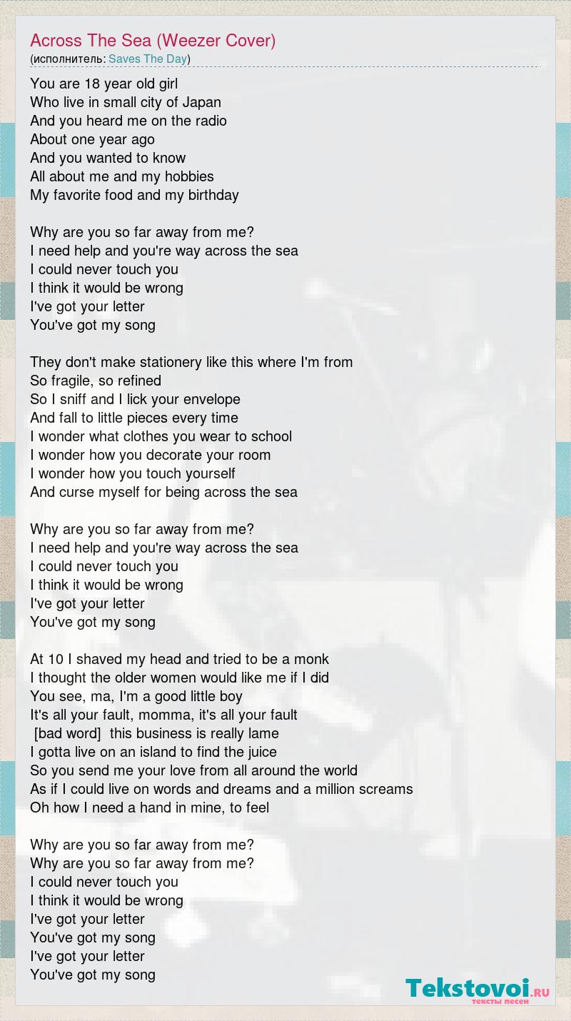 You are 18 year old girl Who live in small city of Japan And you heard me on the radio About one year ago And you wanted to know All about me and my hobbies My favorite food and my birthday Why are you so far away from me? I need help and you're way across the sea I could never touch you I think it would be wrong I've got your letter You've got my song They don't make stationery like this where I'm from So fragile, so refined So I sniff and I lick your envelope And fall to little pieces every time I wonder what clothes you wear to school I wonder how you decorate your room I wonder how you touch yourself And curse myself for being across the sea Why are you so far away from me? I need help and you're way across the sea I could never touch you I think it would be wrong I've got your letter You've got my song At 10 I shaved my head and tried to be a monk I thought the older women would like me if I did You see, ma, I'm a good little boy It's all your fault, momma, it's all your fault [bad word] this business is really lame I gotta live on an island to find the juice So you send me your love from all around the world As if I could live on words and dreams and a million screams Oh how I need a hand in mine, to feel Why are you so far away from me? Why are you so far away from me? I could never touch you I think it would be wrong I've got your letter You've got my song I've got your letter You've got my song