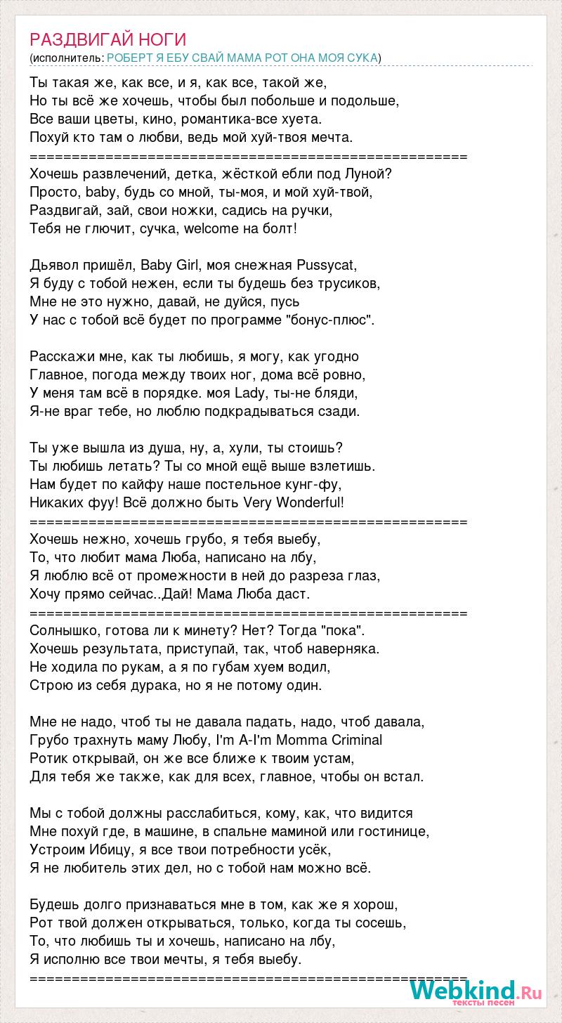 Ты такая же, как все, и я, как все, такой же, Но ты всё же хочешь, чтобы был побольше и подольше, Все ваши цветы, кино, романтика-все хуета. Похуй кто там о любви, ведь мой хуй-твоя мечта. ==================================================== Хочешь развлечений, детка, жёсткой ебли под Луной? Просто, baby, будь со мной, ты-моя, и мой хуй-твой, Раздвигай, зай, свои ножки, садись на ручки, Тебя не глючит, сучка, welcome на болт! Дьявол пришёл, Baby Girl, моя снежная Pussycat, Я буду с тобой нежен, если ты будешь без трусиков, Мне не это нужно, давай, не дуйся, пусь У нас с тобой всё будет по программе "бонус-плюс". Расскажи мне, как ты любишь, я могу, как угодно Главное, погода между твоих ног, дома всё ровно, У меня там всё в порядке. моя Lady, ты-не бляди, Я-не враг тебе, но люблю подкрадываться сзади. Ты уже вышла из душа, ну, а, хули, ты стоишь? Ты любишь летать? Ты со мной ещё выше взлетишь. Нам будет по кайфу наше постельное кунг-фу, Никаких фуу! Всё должно быть Very Wonderful! ==================================================== Хочешь нежно, хочешь грубо, я тебя выебу, То, что любит мама Люба, написано на лбу, Я люблю всё от промежности в ней до разреза глаз, Хочу прямо сейчас..Дай! Мама Люба даст. ==================================================== Солнышко, готова ли к минету? Нет? Тогда "пока". Хочешь результата, приступай, так, чтоб наверняка. Не ходила по рукам, а я по губам хуем водил, Строю из себя дурака, но я не потому один. Мне не надо, чтоб ты не давала падать, надо, чтоб давала, Грубо трахнуть маму Любу, I'm A-I'm Momma Criminal Ротик открывай, он же все ближе к твоим устам, Для тебя же также, как для всех, главное, чтобы он встал. Мы с тобой должны расслабиться, кому, как, что видится Мне похуй где, в машине, в спальне маминой или гостинице, Устроим Ибицу, я все твои потребности усёк, Я не любитель этих дел, но с тобой нам можно всё. Будешь долго признаваться мне в том, как же я хорош, Рот твой должен открываться, только, когда ты сосешь, То, что любишь ты и хочешь, написано на лбу, Я исполню все твои мечты, я тебя выебу. ====================================================
