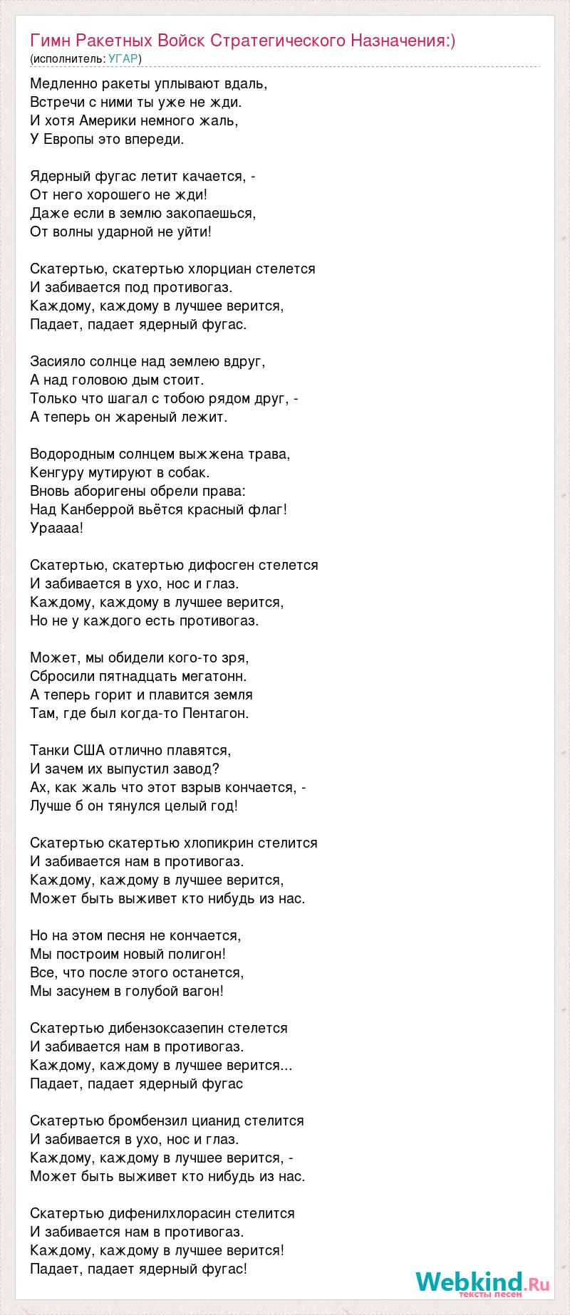 Медленно ракеты уплывают вдаль, Встречи с ними ты уже не жди. И хотя Америки немного жаль, У Европы это впереди. Ядерный фугас летит качается, - От него хорошего не жди! Даже если в землю закопаешься, От волны ударной не уйти! Скатертью, скатертью хлорциан стелется И забивается под противогаз. Каждому, каждому в лучшее верится, Падает, падает ядерный фугас. Засияло солнце над землею вдруг, А над головою дым стоит. Только что шагал с тобою рядом друг, - А теперь он жареный лежит. Водородным солнцем выжжена трава, Кенгуру мутируют в собак. Вновь аборигены обрели права: Над Канберрой вьётся красный флаг! Ураааа! Скатертью, скатертью дифосген стелется И забивается в ухо, нос и глаз. Каждому, каждому в лучшее верится, Но не у каждого есть противогаз. Может, мы обидели кого-то зря, Сбросили пятнадцать мегатонн. А теперь горит и плавится земля Там, где был когда-то Пентагон. Танки США отлично плавятся, И зачем их выпустил завод? Ах, как жаль что этот взрыв кончается, - Лучше б он тянулся целый год! Скатертью скатертью хлопикрин стелится И забивается нам в противогаз. Каждому, каждому в лучшее верится, Может быть выживет кто нибудь из нас. Но на этом песня не кончается, Мы построим новый полигон! Все, что после этого останется, Мы засунем в голубой вагон! Скатертью дибензоксазепин стелется И забивается нам в противогаз. Каждому, каждому в лучшее верится... Падает, падает ядерный фугас Скатертью бромбензил цианид стелится И забивается в ухо, нос и глаз. Каждому, каждому в лучшее верится, - Может быть выживет кто нибудь из нас. Скатертью дифенилхлорасин стелится И забивается нам в противогаз. Каждому, каждому в лучшее верится! Падает, падает ядерный фугас!