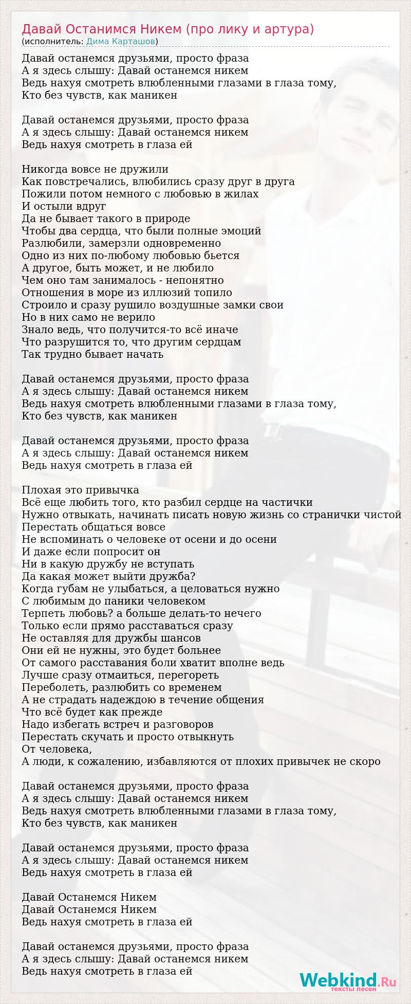 Давай останемся друзьями, просто фраза А я здесь слышу: Давай останемся никем Ведь нахуя смотреть влюбленными глазами в глаза тому, Кто без чувств, как маникен Давай останемся друзьями, просто фраза А я здесь слышу: Давай останемся никем Ведь нахуя смотреть в глаза ей Никогда вовсе не дружили Как повстречались, влюбились сразу друг в друга Пожили потом немного с любовью в жилах И остыли вдруг Да не бывает такого в природе Чтобы два сердца, что были полные эмоций Разлюбили, замерзли одновременно Одно из них по-любому любовью бьется А другое, быть может, и не любило Чем оно там занималось - непонятно Отношения в море из иллюзий топило Строило и сразу рушило воздушные замки свои Но в них само не верило Знало ведь, что получится-то всё иначе Что разрушится то, что другим сердцам Так трудно бывает начать Давай останемся друзьями, просто фраза А я здесь слышу: Давай останемся никем Ведь нахуя смотреть влюбленными глазами в глаза тому, Кто без чувств, как маникен Давай останемся друзьями, просто фраза А я здесь слышу: Давай останемся никем Ведь нахуя смотреть в глаза ей Плохая это привычка Всё еще любить того, кто разбил сердце на частички Нужно отвыкать, начинать писать новую жизнь со странички чистой Перестать общаться вовсе Не вспоминать о человеке от осени и до осени И даже если попросит он Ни в какую дружбу не вступать Да какая может выйти дружба? Когда губам не улыбаться, а целоваться нужно С любимым до паники человеком Терпеть любовь? а больше делать-то нечего Только если прямо расставаться сразу Не оставляя для дружбы шансов Они ей не нужны, это будет больнее От самого расставания боли хватит вполне ведь Лучше сразу отмаиться, перегореть Переболеть, разлюбить со временем А не страдать надеждою в течение общения Что всё будет как прежде Надо избегать встреч и разговоров Перестать скучать и просто отвыкнуть От человека, А люди, к сожалению, избавляются от плохих привычек не скоро Давай останемся друзьями, просто фраза А я здесь слышу: Давай останемся никем Ведь нахуя смотреть влюбленными глазами в глаза тому, Кто без чувств, как маникен Давай останемся друзьями, просто фраза А я здесь слышу: Давай останемся никем Ведь нахуя смотреть в глаза ей Давай Останемся Никем Давай Останемся Никем Ведь нахуя смотреть в глаза ей Давай останемся друзьями, просто фраза А я здесь слышу: Давай останемся никем Ведь нахуя смотреть в глаза ей