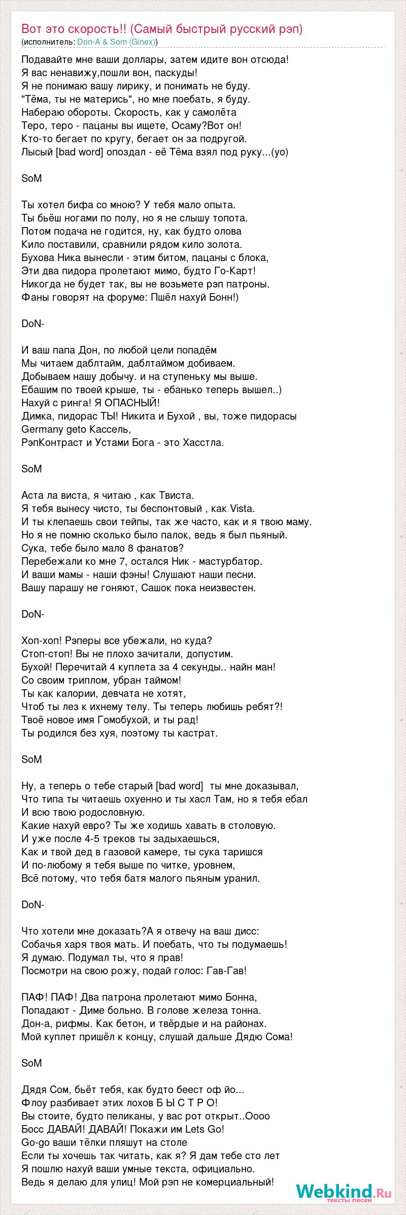 Подавайте мне ваши доллары, затем идите вон отсюда! Я вас ненавижу,пошли вон, паскуды! Я не понимаю вашу лирику, и понимать не буду. "Тёма, ты не матерись", но мне поебать, я буду. Набераю обороты. Скорость, как у самолёта Теро, теро - пацаны вы ищете, Осаму?Вот он! Кто-то бегает по кругу, бегает он за подругой. Лысый [bad word] опоздал - её Тёма взял под руку...(yo) SoM Ты хотел бифа со мною? У тебя мало опыта. Ты бьёш ногами по полу, но я не слышу топота. Потом подача не годится, ну, как будто олова Кило поставили, сравнили рядом кило золота. Бухова Ника вынесли - этим битом, пацаны с блока, Эти два пидора пролетают мимо, будто Го-Карт! Никогда не будет так, вы не возьмете рэп патроны. Фаны говорят на форуме: Пшёл нахуй Бонн!) DoN- И ваш папа Дон, по любой цели попадём Мы читаем даблтайм, даблтаймом добиваем. Добываем нашу добычу. и на ступеньку мы выше. Ебашим по твоей крыше, ты - ебанько теперь вышел..) Нахуй с ринга! Я ОПАСНЫЙ! Димка, пидорас ТЫ! Никита и Бухой , вы, тоже пидорасы Germany geto Кассель, РэпКонтраст и Устами Бога - это Хасстла. SoM Аста ла виста, я читаю , как Твиста. Я тебя вынесу чисто, ты беспонтовый , как Vista. И ты клепаешь свои тейпы, так же часто, как и я твою маму. Но я не помню сколько было палок, ведь я был пьяный. Сука, тебе было мало 8 фанатов? Перебежали ко мне 7, остался Ник - мастурбатор. И ваши мамы - наши фэны! Слушают наши песни. Вашу парашу не гоняют, Сашок пока неизвестен. DoN- Хоп-хоп! Рэперы все убежали, но куда? Стоп-стоп! Вы не плохо зачитали, допустим. Бухой! Перечитай 4 куплета за 4 секунды.. найн ман! Со своим триплом, убран таймом! Ты как калории, девчата не хотят, Чтоб ты лез к ихнему телу. Ты теперь любишь ребят?! Твоё новое имя Гомобухой, и ты рад! Ты родился без хуя, поэтому ты кастрат. SoM Ну, а теперь о тебе старый [bad word] ты мне доказывал, Что типа ты читаешь охуенно и ты хасл Там, но я тебя ебал И всю твою родословную. Какие нахуй евро? Ты же ходишь хавать в столовую. И уже после 4-5 треков ты задыхаешься, Как и твой дед в газовой камере, ты сука таришся И по-любому я тебя выше по читке, уровнем, Всё потому, что тебя батя малого пьяным уранил. DoN- Что хотели мне доказать?А я отвечу на ваш дисс: Собачья харя твоя мать. И поебать, что ты подумаешь! Я думаю. Подумал ты, что я прав! Посмотри на свою рожу, подай голос: Гав-Гав! ПАФ! ПАФ! Два патрона пролетают мимо Бонна, Попадают - Диме больно. В голове железа тонна. Дон-а, рифмы. Как бетон, и твёрдые и на районах. Мой куплет пришёл к концу, слушай дальше Дядю Сома! SoM Дядя Сом, бьёт тебя, как будто беест оф йо... Флоу разбивает этих лохов Б Ы С Т Р О! Вы стоите, будто пеликаны, у вас рот открыт..Оооо Босс ДАВАЙ! ДАВАЙ! Покажи им Lets Go! Go-go ваши тёлки пляшут на столе Если ты хочешь так читать, как я? Я дам тебе сто лет Я пошлю нахуй ваши умные текста, официально. Ведь я делаю для улиц! Мой рэп не комерциальный!