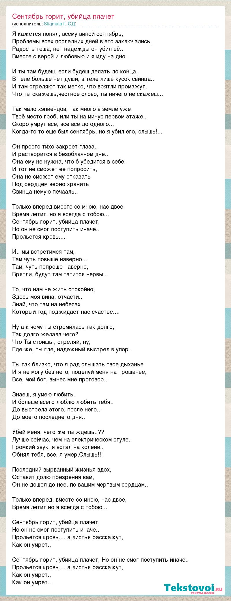 Я кажется понял, всему виной сентябрь, Проблемы всех последних дней в это эаключались, Радость теша, нет надежды он убил её.. Вместе с верой и любовью и я иду на дно.. И ты там будеш, если будеш делать до конца, В теле больше нет души, в теле лишь кусок свинца.. И там стреляют так метко, что врятли промажут, Что ты скажешь,честное слово, ты ничего не скажеш... Так мало хэпиендов, так много в земле уже Твоё место гроб, или ты на минус первом этаже.. Скоро умрут все, все все до одного... Когда-то то еще был сентябрь, но я убил его, слышь!... Он просто тихо закроет глаза.. И растворится в безоблачном дне.. Она ему не нужна, что б убедится в себе. И тот не сможет её попросить, Она не сможет ему отказать Под сердцем верно хранить Свинца немую печааль.. Только вперед,вместе со мною, нас двое Время летит, но я всегда с тобою... Сентябрь горит, убийца плачет, Но он не смог поступить иначе.. Прольется кровь.... И.. мы встретимся там, Там чуть повыше наверно... Там, чуть попроше наверно, Врятли, будут там татится нервы... То, что нам не жить спокойно, Здесь моя вина, отчасти.. Знай, что там на небесах Который год поджидает нас счастье.... Ну а к чему ты стремилась так долго, Так долго желала чего? Что Ты стоишь , стреляй, ну, Где же, ты где, надежный выстрел в упор.. Ты так близко, что я рад слышать твое дыханье И я не могу без него, поцелуй меня на прощанье, Все, мой бог, вынес мне проговор.. Знаеш, я умею любить.. И больше всего люблю любить тебя.. До выстрела этого, после него.. До моего последнего дня.. Убей меня, чего же ты ждешь..?? Лучше сейчас, чем на электрическом стуле.. Громкий звук, я встал на колени.. Обнял тебя, все, я умер,Слышь!!! Последний вырванный жизнья вдох, Оставит долю презрения вам, Он не дошел до нее, по вашим мертвым сердцам.. Только вперед, вместе со мною, нас двое, Время летит,но я всегда с тобою... Сентябрь горит, убийца плачет, Но он не смог поступить иначе.. Прольется кровь.... а листья расскажут, Как он умрет.. Сентябрь горит, убийца плачет, Но он не смог поступить иначе.. Прольется кровь.... а листья расскажут, Как он умрет.. Как он умрет...