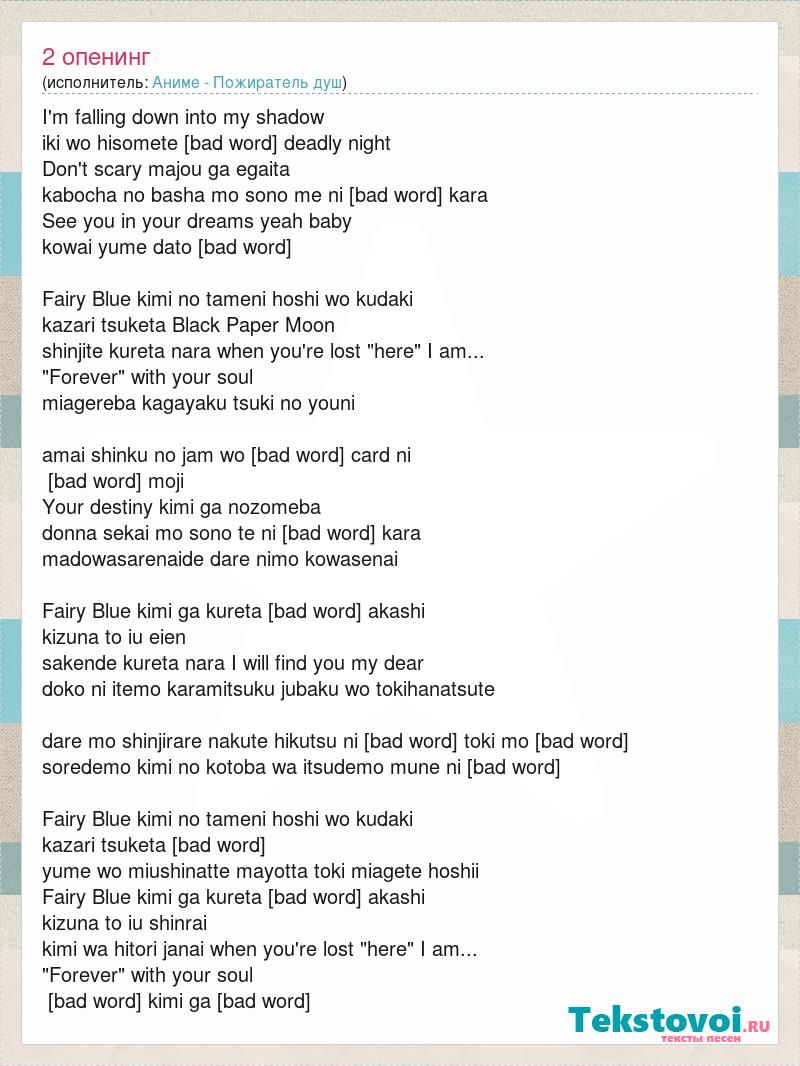 I'm falling down into my shadowiki wo hisomete matteiru deadly nightDon't scary majou ga egaitakabocha no basha mo sono me ni utsuseru karaSee you in your dreams yeah babykowai yume dato shitemoFairy Blue kimi no tameni hoshi wo kudakikazari tsuketa Black Paper Moonshinjite kureta nara when you're lost "here" I am…"Forever" with your soulmiagereba kagayaku tsuki no youniamai shinku no jam wo otoshita card niukabiagaru mojiYour destiny kimi ga nozomebadonna sekai mo sono te ni tsukameru karamadowasarenaide dare nimo kowasenaiFairy Blue kimi... подробнее