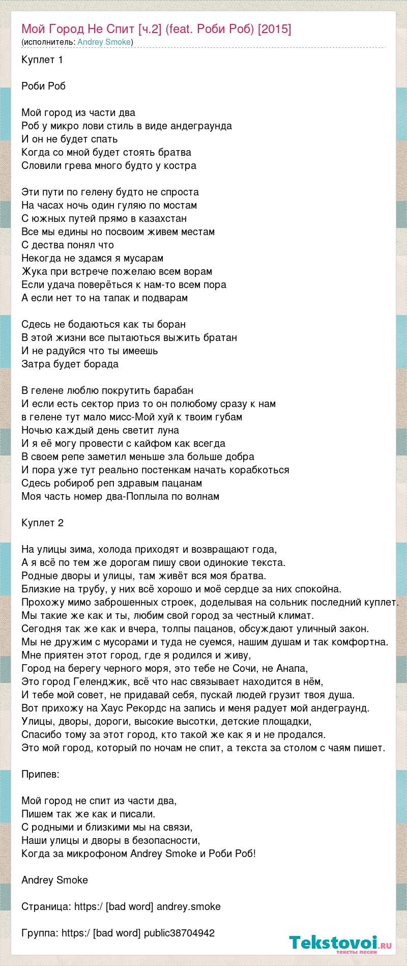Куплет 1 Роби Роб Мой город из части два Роб у микро лови стиль в виде андеграунда И он не будет спать Когда со мной будет стоять братва Словили грева много будто у костра Эти пути по гелену будто не спроста На часах ночь один гуляю по мостам С южных путей прямо в казахстан Все мы едины но посвоим живем местам С дества понял что Некогда не здамся я мусарам Жука при встрече пожелаю всем ворам Если удача поверёться к нам-то всем пора А если нет то на тапак и подварам Сдесь не бодаються как ты боран В этой жизни все пытаються выжить братан И не радуйся что ты имеешь Затра будет борада В гелене люблю покрутить барабан И если есть сектор приз то он полюбому сразу к нам в гелене тут мало мисс-Мой хуй к твоим губам Ночью каждый день светит луна И я её могу провести с кайфом как всегда В своем репе заметил меньше зла больше добра И пора уже тут реально постенкам начать корабкоться Сдесь робироб реп здравым пацанам Моя часть номер два-Поплыла по волнам Куплет 2 На улицы зима, холода приходят и возвращают года, А я всё по тем же дорогам пишу свои одинокие текста. Родные дворы и улицы, там живёт вся моя братва. Близкие на трубу, у них всё хорошо и моё сердце за них спокойна. Прохожу мимо заброшенных строек, доделывая на сольник последний куплет. Мы такие же как и ты, любим свой город за честный климат. Сегодня так же как и вчера, толпы пацанов, обсуждают уличный закон. Мы не дружим с мусорами и туда не суемся, нашим душам и так комфортна. Мне приятен этот город, где я родился и живу, Город на берегу черного моря, это тебе не Сочи, не Анапа, Это город Геленджик, всё что нас связывает находится в нём, И тебе мой совет, не придавай себя, пускай людей грузит твоя душа. Вот прихожу на Хаус Рекордс на запись и меня радует мой андеграунд. Улицы, дворы, дороги, высокие высотки, детские площадки, Спасибо тому за этот город, кто такой же как я и не продался. Это мой город, который по ночам не спит, а текста за столом с чаям пишет. Припев: Мой город не спит из части два, Пишем так же как и писали. С родными и близкими мы на связи, Наши улицы и дворы в безопасности, Когда за микрофоном Andrey Smoke и Роби Роб! Andrey Smoke Страница: https:/ [bad word] andrey.smoke Группа: https:/ [bad word] public38704942