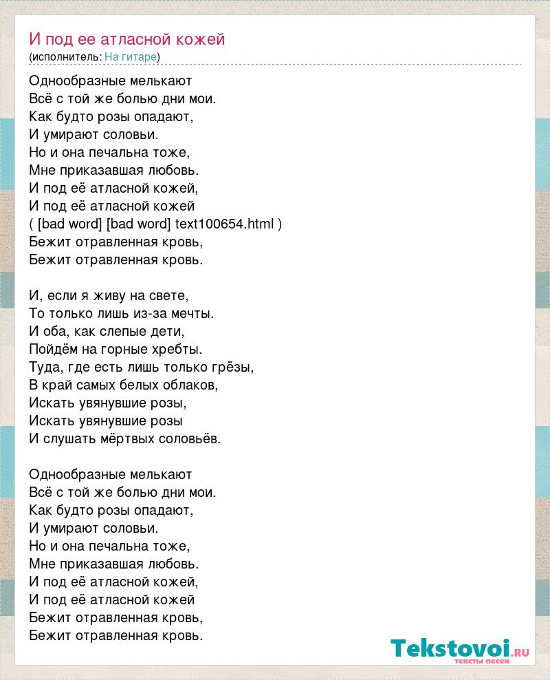 Однообразные мелькают Всё с той же болью дни мои. Как будто розы опадают, И умирают соловьи. Но и она печальна тоже, Мне приказавшая любовь. И под её атласной кожей, И под её атласной кожей ( [bad word] [bad word] text100654.html ) Бежит отравленная кровь, Бежит отравленная кровь. И, если я живу на свете, То только лишь из-за мечты. И оба, как слепые дети, Пойдём на горные хребты. Туда, где есть лишь только грёзы, В край самых белых облаков, Искать увянувшие розы, Искать увянувшие розы И слушать мёртвых соловьёв. Однообразные мелькают Всё с той же болью дни мои. Как будто розы опадают, И умирают соловьи. Но и она печальна тоже, Мне приказавшая любовь. И под её атласной кожей, И под её атласной кожей Бежит отравленная кровь, Бежит отравленная кровь.