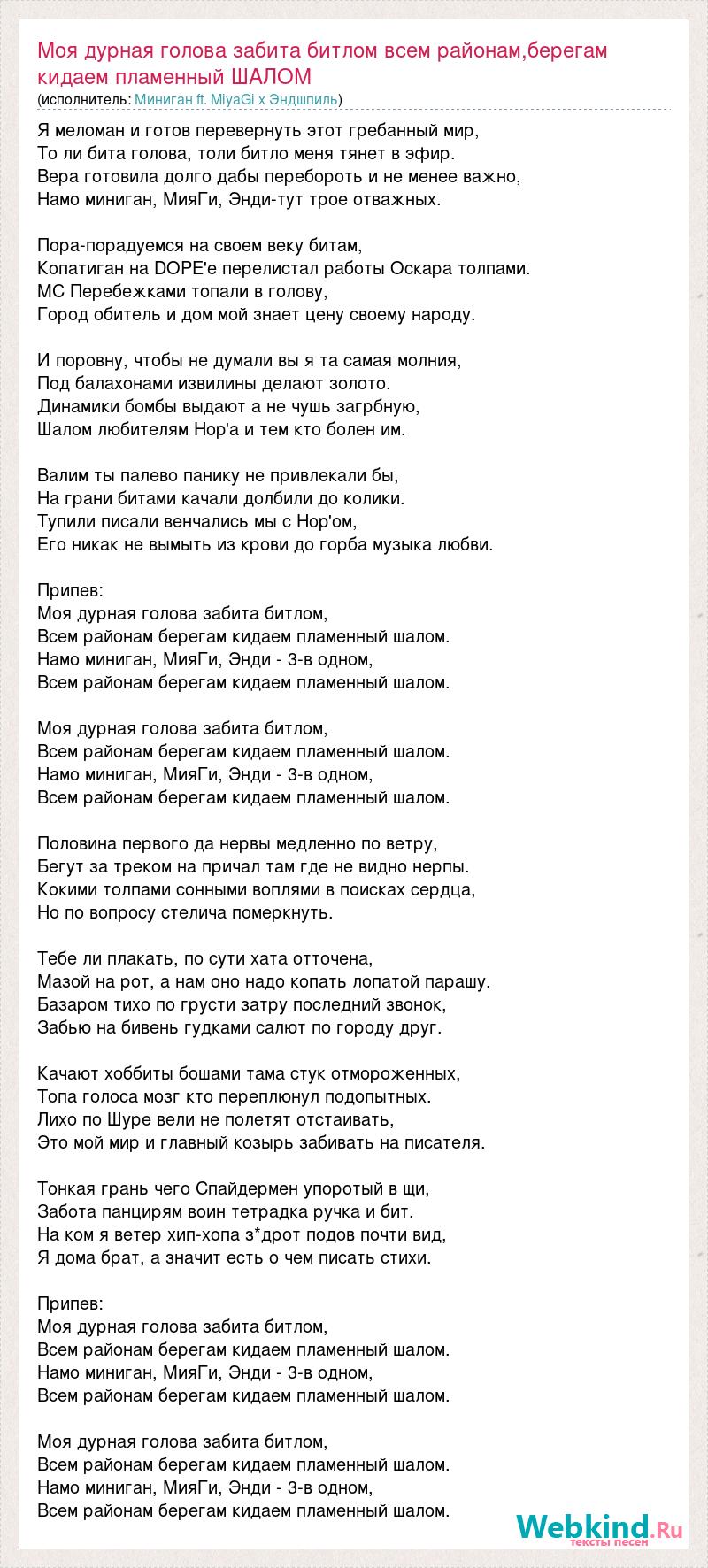 Я меломан и готов перевернуть этот гребанный мир, То ли бита голова, толи битло меня тянет в эфир. Вера готовила долго дабы перебороть и не менее важно, Намо миниган, МияГи, Энди-тут трое отважных. Пора-порадуемся на своем веку битам, Копатиган на DOPE'е перелистал работы Оскара толпами. MC Перебежками топали в голову, Город обитель и дом мой знает цену своему народу. И поровну, чтобы не думали вы я та самая молния, Под балахонами извилины делают золото. Динамики бомбы выдают а не чушь загрбную, Шалом любителям Hop'а и тем кто болен им. Валим ты палево панику не привлекали бы, На грани битами качали долбили до колики. Тупили писали венчались мы с Hop'ом, Его никак не вымыть из крови до горба музыка любви. Припев: Моя дурная голова забита битлом, Всем районам берегам кидаем пламенный шалом. Намо миниган, МияГи, Энди - 3-в одном, Всем районам берегам кидаем пламенный шалом. Моя дурная голова забита битлом, Всем районам берегам кидаем пламенный шалом. Намо миниган, МияГи, Энди - 3-в одном, Всем районам берегам кидаем пламенный шалом. Половина первого да нервы медленно по ветру, Бегут за треком на причал там где не видно нерпы. Кокими толпами сонными воплями в поисках сердца, Но по вопросу стелича померкнуть. Тебе ли плакать, по сути хата отточена, Мазой на рот, а нам оно надо копать лопатой парашу. Базаром тихо по грусти затру последний звонок, Забью на бивень гудками салют по городу друг. Качают хоббиты бошами тама стук отмороженных, Топа голоса мозг кто переплюнул подопытных. Лихо по Шуре вели не полетят отстаивать, Это мой мир и главный козырь забивать на писателя. Тонкая грань чего Спайдермен упоротый в щи, Забота панцирям воин тетрадка ручка и бит. На ком я ветер хип-хопа з*дрот подов почти вид, Я дома брат, а значит есть о чем писать стихи. Припев: Моя дурная голова забита битлом, Всем районам берегам кидаем пламенный шалом. Намо миниган, МияГи, Энди - 3-в одном, Всем районам берегам кидаем пламенный шалом. Моя дурная голова забита битлом, Всем районам берегам кидаем пламенный шалом. Намо миниган, МияГи, Энди - 3-в одном, Всем районам берегам кидаем пламенный шалом.