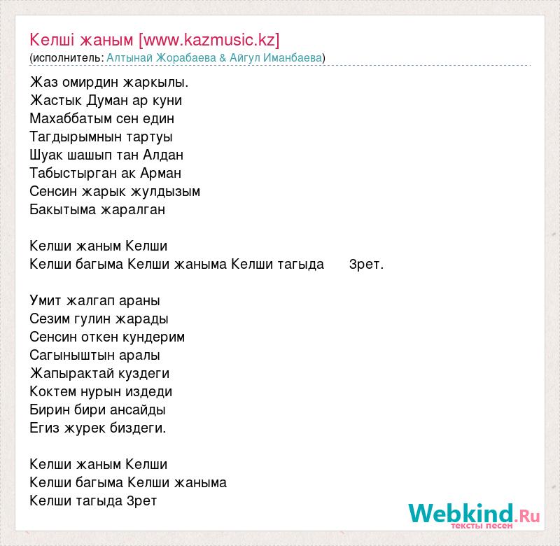 Жаз омирдин жаркылы. Жастык Думан ар куни Махаббатым сен един Тагдырымнын тартуы Шуак шашып тан Алдан Табыстырган ак Арман Сенсин жарык жулдызым Бакытыма жаралган Келши жаным Келши Келши багыма Келши жаныма Келши тагыда 3рет. Умит жалгап араны Сезим гулин жарады Сенсин откен кундерим Сагыныштын аралы Жапырактай куздеги Коктем нурын издеди Бирин бири ансайды Егиз журек биздеги. Келши жаным Келши Келши багыма Келши жаныма Келши тагыда 3рет