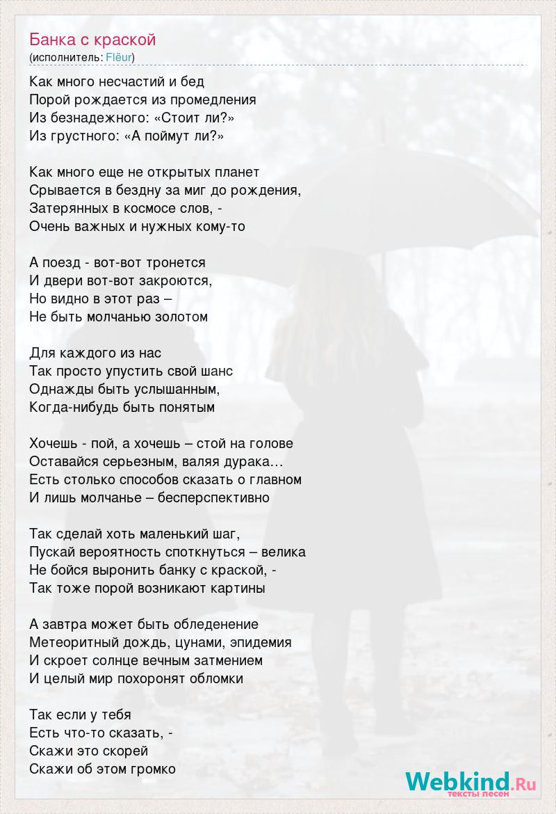 Как много несчастий и бед Порой рождается из промедления Из безнадежного: «Стоит ли?» Из грустного: «А поймут ли?» Как много еще не открытых планет Срывается в бездну за миг до рождения, Затерянных в космосе слов, - Очень важных и нужных кому-то А поезд - вот-вот тронется И двери вот-вот закроются, Но видно в этот раз – Не быть молчанью золотом Для каждого из нас Так просто упустить свой шанс Однажды быть услышанным, Когда-нибудь быть понятым Хочешь - пой, а хочешь – стой на голове Оставайся серьезным, валяя дурака… Есть столько способов сказать о главном И лишь молчанье – бесперспективно Так сделай хоть маленький шаг, Пускай вероятность споткнуться – велика Не бойся выронить банку с краской, - Так тоже порой возникают картины А завтра может быть обледенение Метеоритный дождь, цунами, эпидемия И скроет солнце вечным затмением И целый мир похоронят обломки Так если у тебя Есть что-то сказать, - Скажи это скорей Скажи об этом громко