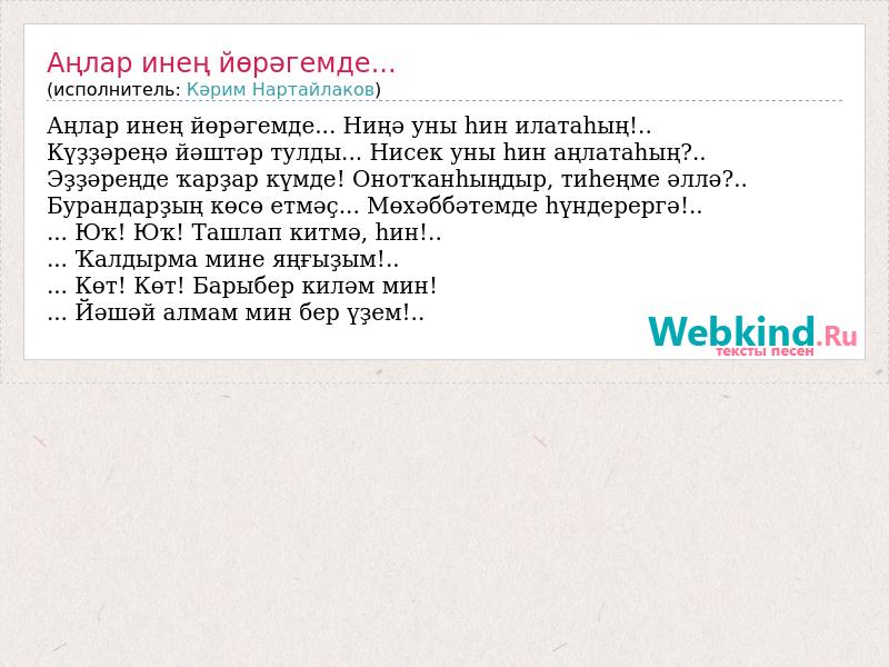 Аңлар инең йөрәгемде... Ниңә уны һин илатаһың!.. Күҙҙәреңә йәштәр тулды... Нисек уны һин аңлатаһың?.. Эҙҙәреңде ҡарҙар күмде! Онотҡанһыңдыр, тиһеңме әллә?.. Бурандарҙың көсө етмәҫ... Мөхәббәтемде һүндерергә!.. ... Юҡ! Юҡ! Ташлап китмә, һин!.. ... Ҡалдырма мине яңғыҙым!.. ... Көт! Көт! Барыбер киләм мин! ... Йәшәй алмам мин бер үҙем!..