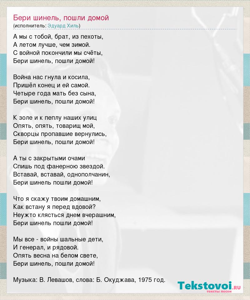А мы с тобой, брат, из пехоты, А летом лучше, чем зимой. С войной покончили мы счёты, Бери шинель, пошли домой! Война нас гнула и косила, Пришёл конец и ей самой. Четыре года мать без сына, Бери шинель, пошли домой! К золе и к пеплу наших улиц Опять, опять, товарищ мой, Скворцы пропавшие вернулись, Бери шинель, пошли домой! А ты с закрытыми очами Спишь под фанерною звездой. Вставай, вставай, однополчанин, Бери шинель пошли домой! Что я скажу твоим домашним, Как встану я перед вдовой? Неужто клясться днем вчерашним, Бери шинель пошли домой! Мы все - войны шальные дети, И генерал, и рядовой. Опять весна на белом свете, Бери шинель, пошли домой! Музыка: В. Левашов, слова: Б. Окуджава, 1975 год.