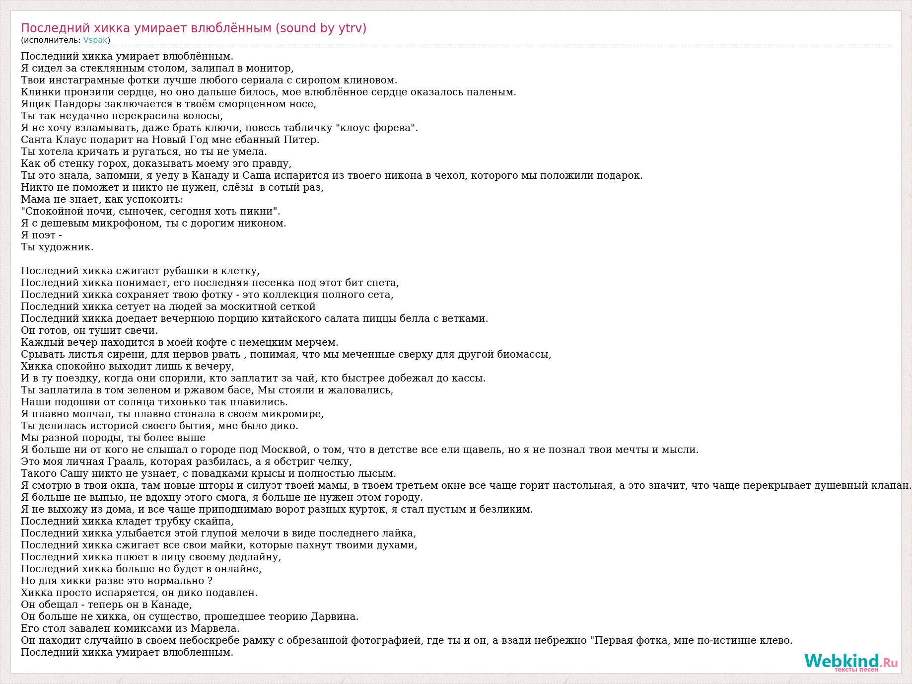 А как ты думаешь, о чем песня "Последний хикка умирает влюблённым (sound by ytrv)" ?