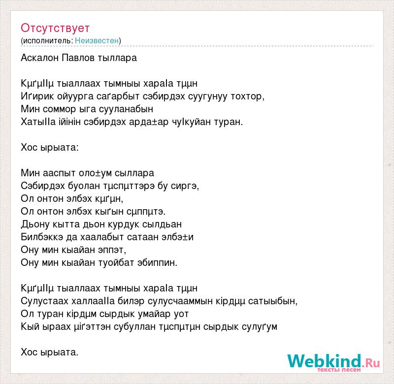 Аскалон Павлов тыллара КµґµІІµ тыаллаах тымныы хараІа тµµн Иґирик ойуурга саґарбыт сэбирдэх суугунуу тохтор, Мин соммор ыга сууланабын ХатыІІа ійінін сэбирдэх арда±ар чуІкуйан туран. Хос ырыата: Мин ааспыт оло±ум сыллара Сэбирдэх буолан тµспµттэрэ бу сиргэ, Ол онтон элбэх 굴µн, Ол онтон элбэх кыґын сµппµтэ. Дьону кытта дьон курдук сылдьан Билбэккэ да хаалабыт сатаан элбэ±и Ону мин кыайан эппэт, Ону мин кыайан туойбат эбиппин. КµґµІІµ тыаллаах тымныы хараІа тµµн Сулустаах халлааІІа билэр сулусчааммын кірдµµ сатыыбын, Ол туран кірдµм сырдык умайар уот Кый ыраах µіґэттэн субуллан тµспµтµн сырдык сулуґум Хос ырыата.