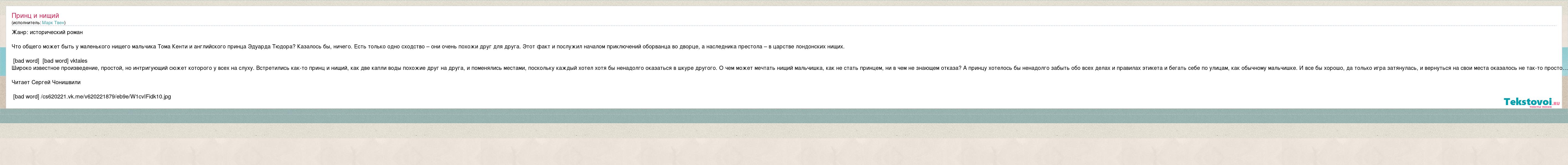 Жанр: исторический роман Что общего может быть у маленького нищего мальчика Тома Кенти и английского принца Эдуарда Тюдора? Казалось бы, ничего. Есть только одно сходство – они очень похожи друг для друга. Этот факт и послужил началом приключений оборванца во дворце, а наследника престола – в царстве лондонских нищих. [bad word] [bad word] vktales Широко известное произведение, простой, но интригующий сюжет которого у всех на слуху. Встретились как-то принц и нищий, как две капли воды похожие друг на друга, и поменялись местами, поскольку каждый хотел хотя бы ненадолго оказаться в шкуре другого. О чем может мечтать нищий мальчишка, как не стать принцем, ни в чем не знающем отказа? А принцу хотелось бы ненадолго забыть обо всех делах и правилах этикета и бегать себе по улицам, как обычному мальчишке. И все бы хорошо, да только игра затянулась, и вернуться на свои места оказалось не так-то просто… Читает Сергей Чонишвили [bad word] /cs620221.vk.me/v620221879/eb9e/W1cvIFidk10.jpg