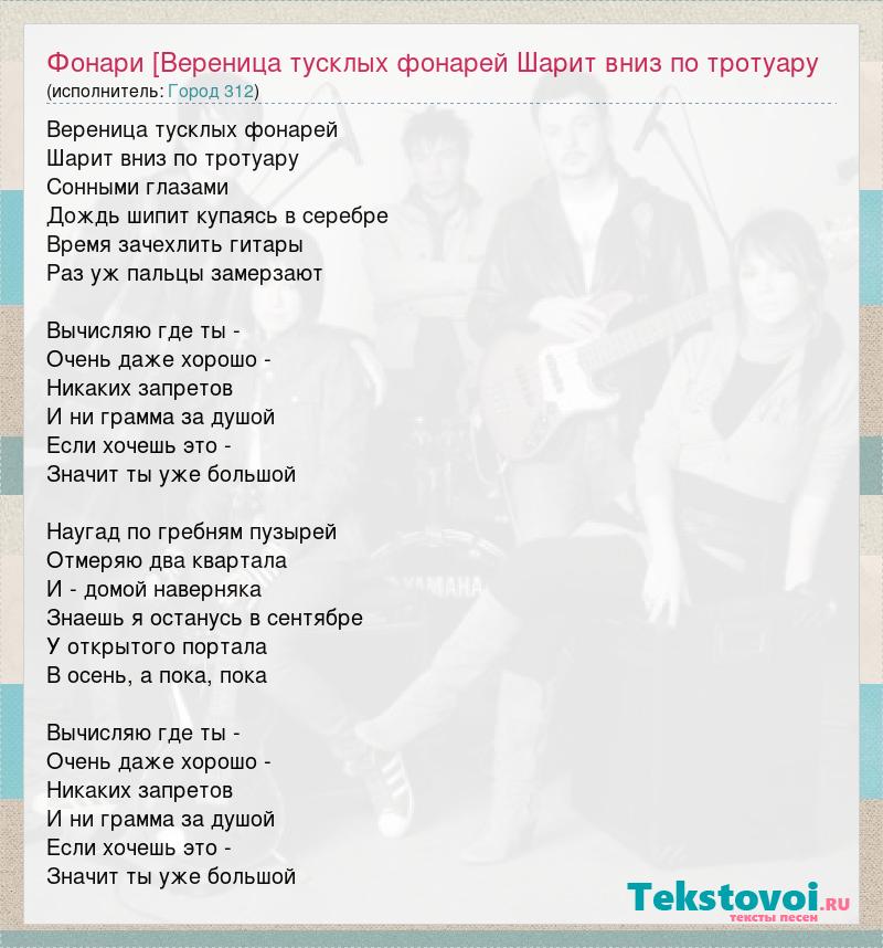 Главная→Исполнители→Город 312→Фонари [Вереница тусклых фонарей Шарит вниз по тротуару Сонными глазами