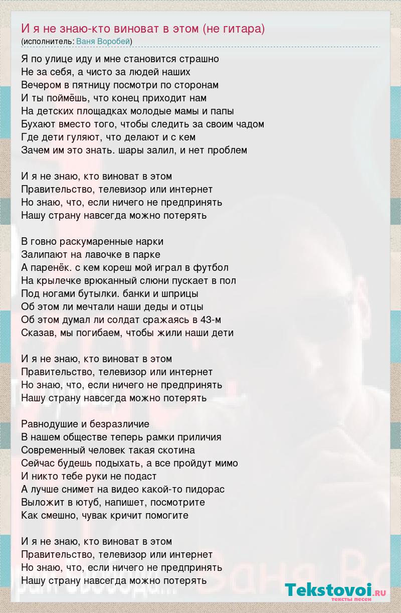 Я по улице иду и мне становится страшно Не за себя, а чисто за людей наших Вечером в пятницу посмотри по сторонам И ты поймёшь, что конец приходит нам На детских площадках молодые мамы и папы Бухают вместо того, чтобы следить за своим чадом Где дети гуляют, что делают и с кем Зачем им это знать. шары залил, и нет проблем И я не знаю, кто виноват в этом Правительство, телевизор или интернет Но знаю, что, если ничего не предпринять Нашу страну навсегда можно потерять В говно раскумаренные нарки Залипают на лавочке в парке А паренёк. с кем кореш мой играл в футбол На крылечке врюканный слюни пускает в пол Под ногами бутылки. банки и шприцы Об этом ли мечтали наши деды и отцы Об этом думал ли солдат сражаясь в 43-м Сказав, мы погибаем, чтобы жили наши дети И я не знаю, кто виноват в этом Правительство, телевизор или интернет Но знаю, что, если ничего не предпринять Нашу страну навсегда можно потерять Равнодушие и безразличие В нашем обществе теперь рамки приличия Современный человек такая скотина Сейчас будешь подыхать, а все пройдут мимо И никто тебе руки не подаст А лучше снимет на видео какой-то пидорас Выложит в ютуб, напишет, посмотрите Как смешно, чувак кричит помогите И я не знаю, кто виноват в этом Правительство, телевизор или интернет Но знаю, что, если ничего не предпринять Нашу страну навсегда можно потерять