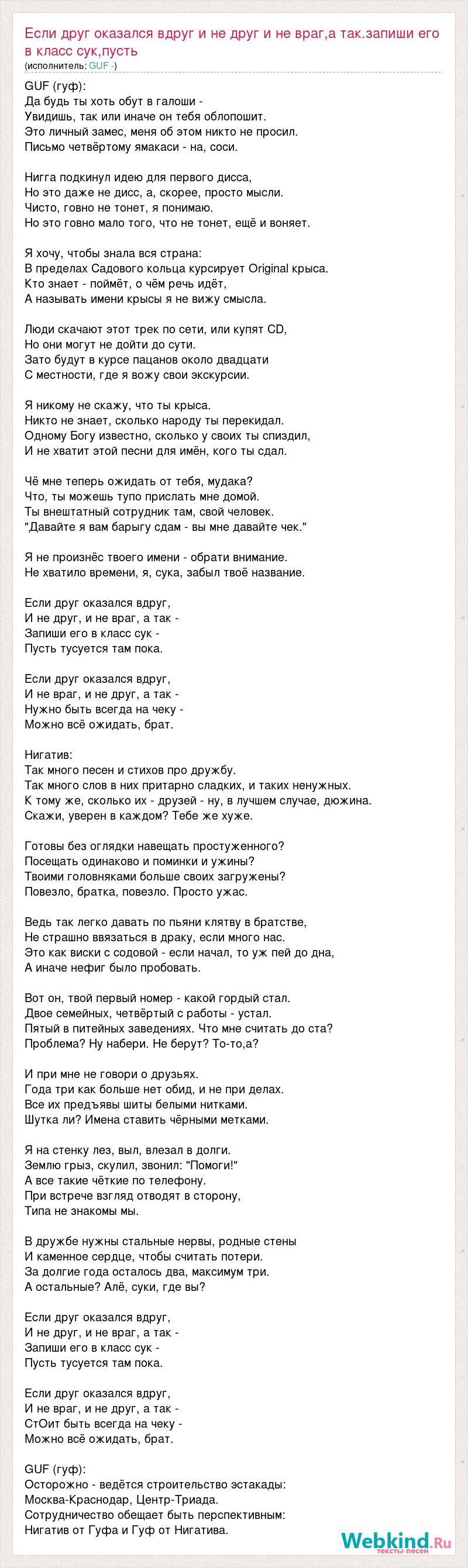 GUF (гуф): Да будь ты хоть обут в галоши - Увидишь, так или иначе он тебя облопошит. Это личный замес, меня об этом никто не просил. Письмо четвёртому ямакаси - на, соси. Нигга подкинул идею для первого дисса, Но это даже не дисс, а, скорее, просто мысли. Чисто, говно не тонет, я понимаю. Но это говно мало того, что не тонет, ещё и воняет. Я хочу, чтобы знала вся страна: В пределах Садового кольца курсирует Original крыса. Кто знает - поймёт, о чём речь идёт, А называть имени крысы я не вижу смысла. Люди скачают этот трек по сети, или купят CD, Но они могут не дойти до сути. Зато будут в курсе пацанов около двадцати С местности, где я вожу свои экскурсии. Я никому не скажу, что ты крыса. Никто не знает, сколько народу ты перекидал. Одному Богу известно, сколько у своих ты спиздил, И не хватит этой песни для имён, кого ты сдал. Чё мне теперь ожидать от тебя, мудака? Что, ты можешь тупо прислать мне домой. Ты внештатный сотрудник там, свой человек. "Давайте я вам барыгу сдам - вы мне давайте чек." Я не произнёс твоего имени - обрати внимание. Не хватило времени, я, сука, забыл твоё название. Если друг оказался вдруг, И не друг, и не враг, а так - Запиши его в класс сук - Пусть тусуется там пока. Если друг оказался вдруг, И не враг, и не друг, а так - Нужно быть всегда на чеку - Можно всё ожидать, брат. Нигатив: Так много песен и стихов про дружбу. Так много слов в них притарно сладких, и таких ненужных. К тому же, сколько их - друзей - ну, в лучшем случае, дюжина. Скажи, уверен в каждом? Тебе же хуже. Готовы без оглядки навещать простуженного? Посещать одинаково и поминки и ужины? Твоими головняками больше своих загружены? Повезло, братка, повезло. Просто ужас. Ведь так легко давать по пьяни клятву в братстве, Не страшно ввязаться в драку, если много нас. Это как виски с содовой - если начал, то уж пей до дна, А иначе нефиг было пробовать. Вот он, твой первый номер - какой гордый стал. Двое семейных, четвёртый с работы - устал. Пятый в питейных заведениях. Что мне считать до ста? Проблема? Ну набери. Не берут? То-то,а? И при мне не говори о друзьях. Года три как больше нет обид, и не при делах. Все их предъявы шиты белыми нитками. Шутка ли? Имена ставить чёрными метками. Я на стенку лез, выл, влезал в долги. Землю грыз, скулил, звонил: "Помоги!" А все такие чёткие по телефону. При встрече взгляд отводят в сторону, Типа не знакомы мы. В дружбе нужны стальные нервы, родные стены И каменное сердце, чтобы считать потери. За долгие года осталось два, максимум три. А остальные? Алё, суки, где вы? Если друг оказался вдруг, И не друг, и не враг, а так - Запиши его в класс сук - Пусть тусуется там пока. Если друг оказался вдруг, И не враг, и не друг, а так - СтОит быть всегда на чеку - Можно всё ожидать, брат. GUF (гуф): Осторожно - ведётся строительство эстакады: Москва-Краснодар, Центр-Триада. Сотрудничество обещает быть перспективным: Нигатив от Гуфа и Гуф от Нигатива.