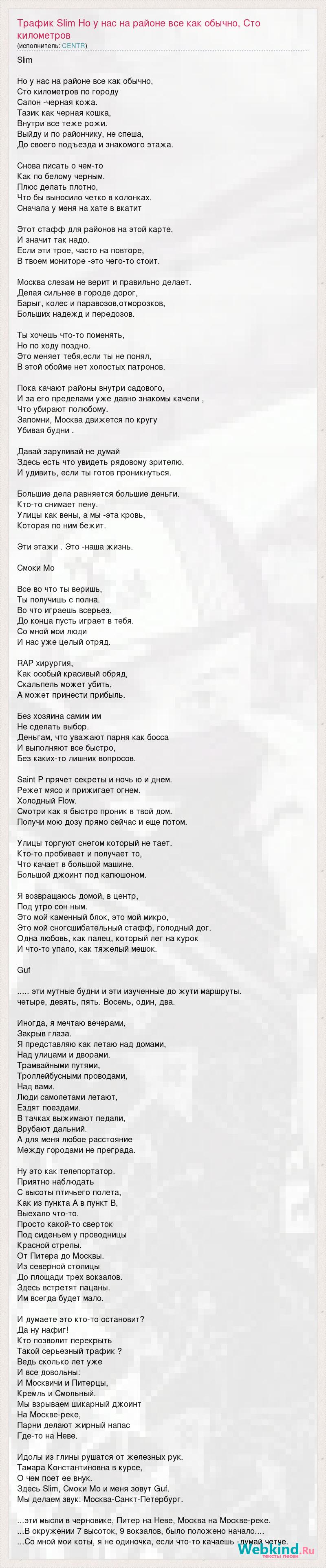 Slim Но у нас на районе все как обычно, Сто километров по городу Салон -черная кожа. Тазик как черная кошка, Внутри все теже рожи. Выйду и по райончику, не спеша, До своего подъезда и знакомого этажа. Снова писать о чем-то Как по белому черным. Плюс делать плотно, Что бы выносило четко в колонках. Сначала у меня на хате в вкатит Этот стафф для районов на этой карте. И значит так надо. Если эти трое, часто на повторе, В твоем мониторе -это чего-то стоит. Москва слезам не верит и правильно делает. Делая сильнее в городе дорог, Барыг, колес и паравозов,отморозков, Больших надежд и передозов. Ты хочешь что-то поменять, Но по ходу поздно. Это меняет тебя,если ты не понял, В этой обойме нет холостых патронов. Пока качают районы внутри садового, И за его пределами уже давно знакомы качели , Что убирают полюбому. Запомни, Москва движется по кругу Убивая будни . Давай заруливай не думай Здесь есть что увидеть рядовому зрителю. И удивить, если ты готов проникнуться. Большие дела равняется большие деньги. Кто-то снимает пену. Улицы как вены, а мы -эта кровь, Которая по ним бежит. Эти этажи . Это -наша жизнь. Смоки Мо Все во что ты веришь, Ты получишь с полна. Во что играешь всерьез, До конца пусть играет в тебя. Со мной мои люди И нас уже целый отряд. RAP хирургия, Как особый красивый обряд, Скальпель может убить, А может принести прибыль. Без хозяина самим им Не сделать выбор. Деньгам, что уважают парня как босса И выполняют все быстро, Без каких-то лишних вопросов. Saint P прячет секреты и ночь ю и днем. Режет мясо и прижигает огнем. Холодный Flow. Смотри как я быстро проник в твой дом. Получи мою дозу прямо сейчас и еще потом. Улицы торгуют снегом который не тает. Кто-то пробивает и получает то, Что качает в большой машине. Большой джоинт под капюшоном. Я возвращаюсь домой, в центр, Под утро сон ным. Это мой каменный блок, это мой микро, Это мой сногсшибательный стафф, голодный дог. Одна любовь, как палец, который лег на курок И что-то упало, как тяжелый мешок. Guf ..... эти мутные будни и эти изученные до жути маршруты. четыре, девять, пять. Восемь, один, два. Иногда, я мечтаю вечерами, Закрыв глаза. Я представляю как летаю над домами, Над улицами и дворами. Трамвайными путями, Троллейбусными проводами, Над вами. Люди самолетами летают, Ездят поездами. В тачках выжимают педали, Врубают дальний. А для меня любое расстояние Между городами не преграда. Ну это как телепортатор. Приятно наблюдать С высоты птичьего полета, Как из пункта А в пункт B, Выехало что-то. Просто какой-то сверток Под сиденьем у проводницы Красной стрелы. От Питера до Москвы. Из северной столицы До площади трех вокзалов. Здесь встретят пацаны. Им всегда будет мало. И думаете это кто-то остановит? Да ну нафиг! Кто позволит перекрыть Такой серьезный трафик ? Ведь сколько лет уже И все довольны: И Москвичи и Питерцы, Кремль и Смольный. Мы взрываем шикарный джоинт На Москве-реке, Парни делают жирный напас Где-то на Неве. Идолы из глины рушатся от железных рук. Тамара Константиновна в курсе, О чем поет ее внук. Здесь Slim, Смоки Мо и меня зовут Guf. Мы делаем звук: Москва-Санкт-Петербург. ...эти мысли в черновике, Питер на Неве, Москва на Москве-реке. ...В окружении 7 высоток, 9 вокзалов, было положено начало.... ...Со мной мои коты, я не одиночка, если что-то качаешь -думай четче.