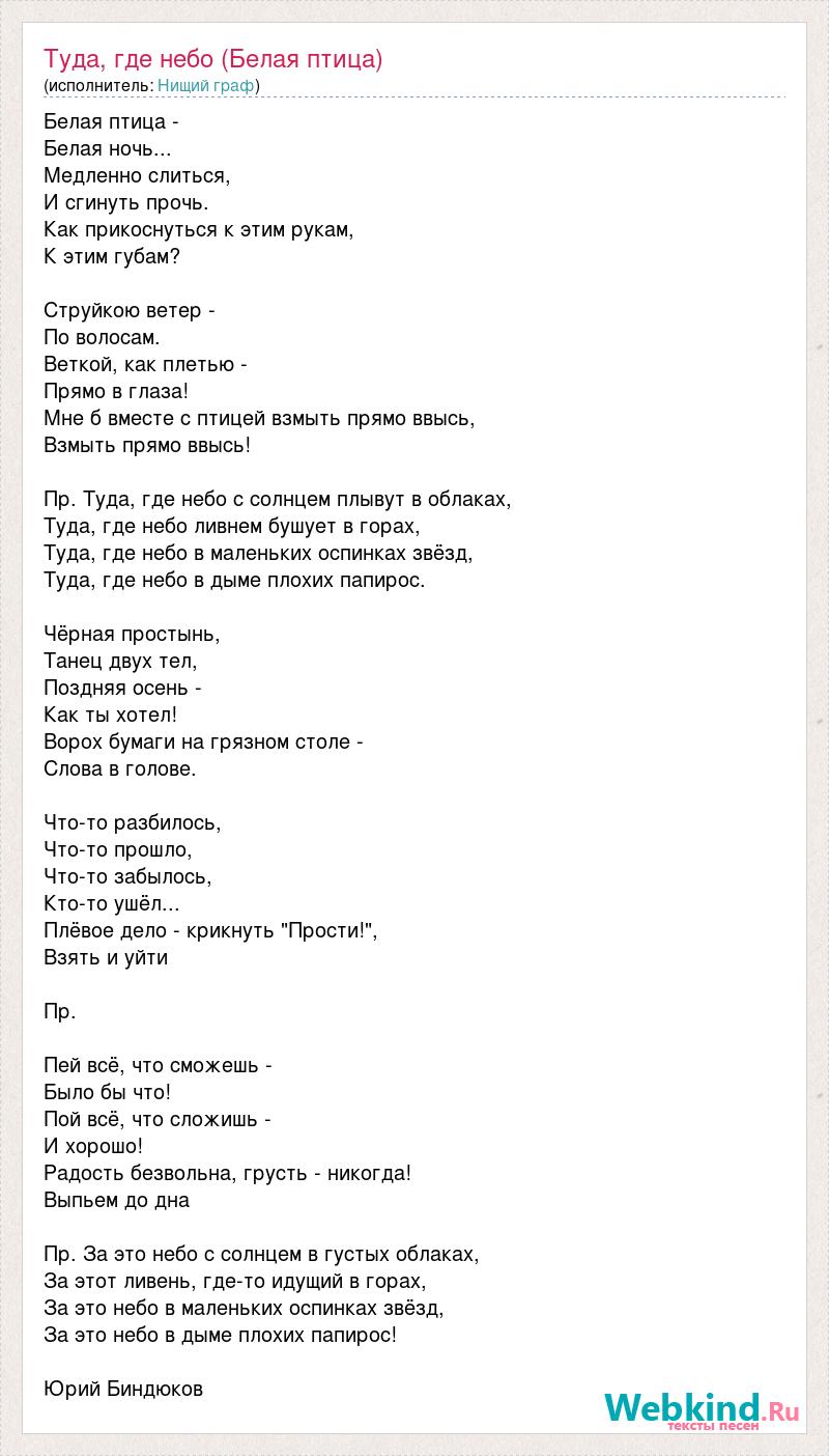Белая птица - Белая ночь... Медленно слиться, И сгинуть прочь. Как прикоснуться к этим рукам, К этим губам? Струйкою ветер - По волосам. Веткой, как плетью - Прямо в глаза! Мне б вместе с птицей взмыть прямо ввысь, Взмыть прямо ввысь! Пр. Туда, где небо с солнцем плывут в облаках, Туда, где небо ливнем бушует в горах, Туда, где небо в маленьких оспинках звёзд, Туда, где небо в дыме плохих папирос. Чёрная простынь, Танец двух тел, Поздняя осень - Как ты хотел! Ворох бумаги на грязном столе - Слова в голове. Что-то разбилось, Что-то прошло, Что-то забылось, Кто-то ушёл... Плёвое дело - крикнуть "Прости!", Взять и уйти Пр. Пей всё, что сможешь - Было бы что! Пой всё, что сложишь - И хорошо! Радость безвольна, грусть - никогда! Выпьем до дна Пр. За это небо с солнцем в густых облаках, За этот ливень, где-то идущий в горах, За это небо в маленьких оспинках звёзд, За это небо в дыме плохих папирос! Юрий Биндюков