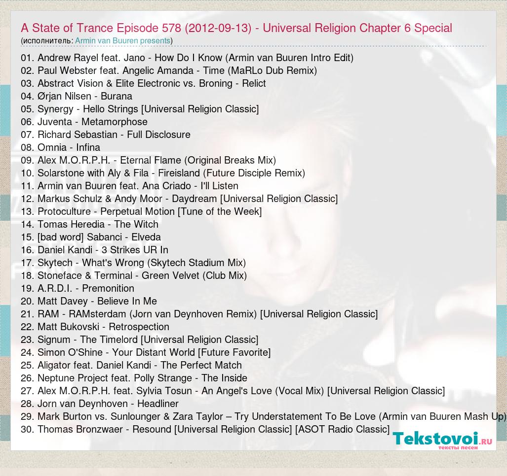 Главная→Исполнители→Armin van Buuren Presents→A State of Trance Episode 578 (2012-09-13) - Universal Religion Chapter