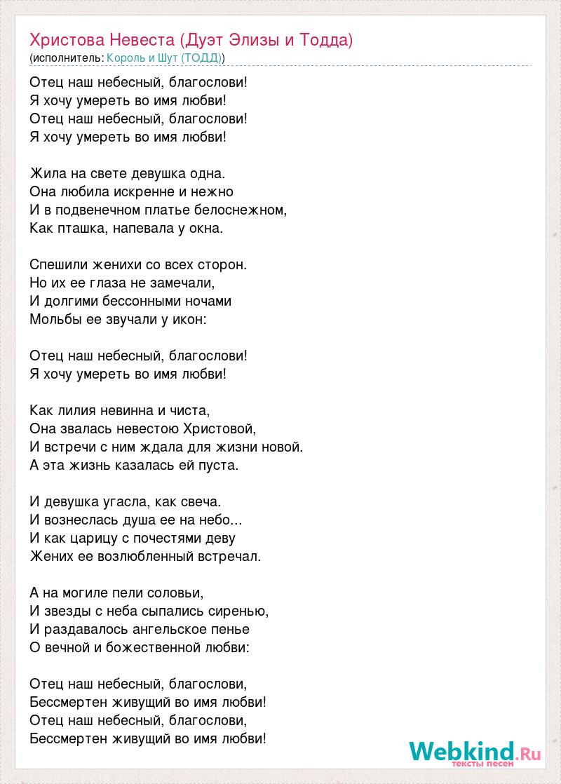 Отец наш небесный, благослови! Я хочу умереть во имя любви! Отец наш небесный, благослови! Я хочу умереть во имя любви! Жила на свете девушка одна. Она любила искренне и нежно И в подвенечном платье белоснежном, Как пташка, напевала у окна. Спешили женихи со всех сторон. Но их ее глаза не замечали, И долгими бессонными ночами Мольбы ее звучали у икон: Отец наш небесный, благослови! Я хочу умереть во имя любви! Как лилия невинна и чиста, Она звалась невестою Христовой, И встречи с ним ждала для жизни новой. А эта жизнь казалась ей пуста. И девушка угасла, как свеча. И вознеслась душа ее на небо... И как царицу с почестями деву Жених ее возлюбленный встречал. А на могиле пели соловьи, И звезды с неба сыпались сиренью, И раздавалось ангельское пенье О вечной и божественной любви: Отец наш небесный, благослови, Бессмертен живущий во имя любви! Отец наш небесный, благослови, Бессмертен живущий во имя любви!
