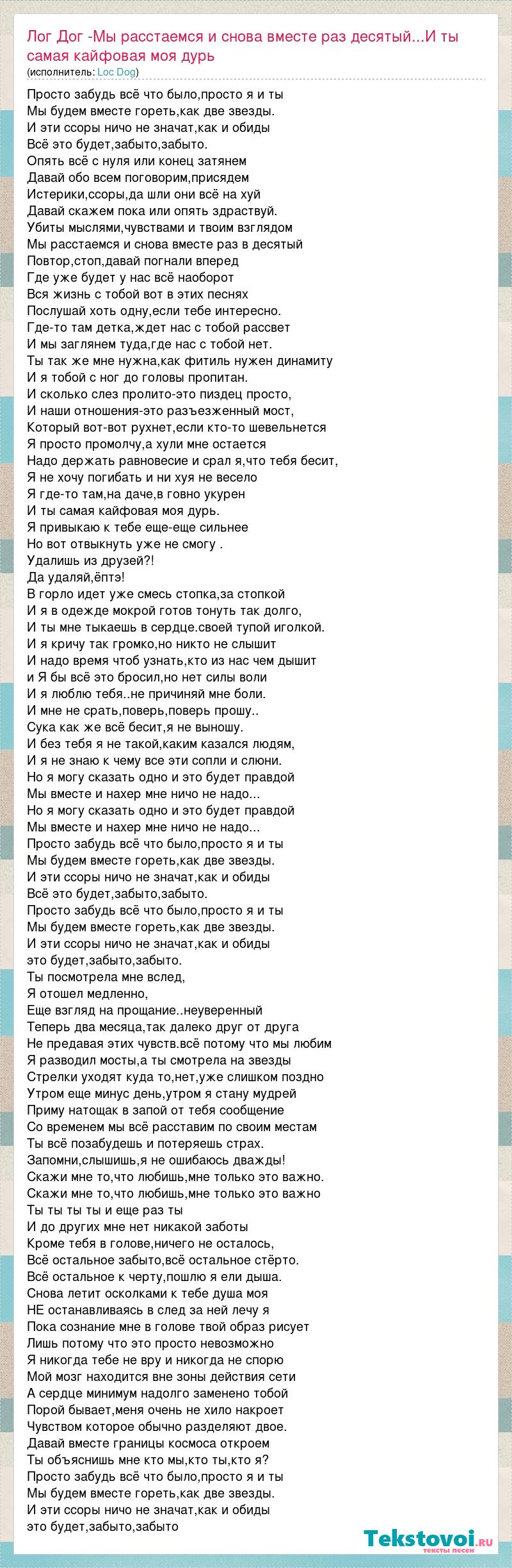 Просто забудь всё что было,просто я и ты Мы будем вместе гореть,как две звезды. И эти ссоры ничо не значат,как и обиды Всё это будет,забыто,забыто. Опять всё с нуля или конец затянем Давай обо всем поговорим,присядем Истерики,ссоры,да шли они всё на хуй Давай скажем пока или опять здраствуй. Убиты мыслями,чувствами и твоим взглядом Мы расстаемся и снова вместе раз в десятый Повтор,стоп,давай погнали вперед Где уже будет у нас всё наоборот Вся жизнь с тобой вот в этих песнях Послушай хоть одну,если тебе интересно. Где-то там детка,ждет нас с тобой рассвет И мы заглянем туда,где нас с тобой нет. Ты так же мне нужна,как фитиль нужен динамиту И я тобой с ног до головы пропитан. И сколько слез пролито-это пиздец просто, И наши отношения-это разъезженный мост, Который вот-вот рухнет,если кто-то шевельнется Я просто промолчу,а хули мне остается Надо держать равновесие и срал я,что тебя бесит, Я не хочу погибать и ни хуя не весело Я где-то там,на даче,в говно укурен И ты самая кайфовая моя дурь. Я привыкаю к тебе еще-еще сильнее Но вот отвыкнуть уже не смогу . Удалишь из друзей?! Да удаляй,ёптэ! В горло идет уже смесь стопка,за стопкой И я в одежде мокрой готов тонуть так долго, И ты мне тыкаешь в сердце.своей тупой иголкой. И я кричу так громко,но никто не слышит И надо время чтоб узнать,кто из нас чем дышит и Я бы всё это бросил,но нет силы воли И я люблю тебя..не причиняй мне боли. И мне не срать,поверь,поверь прошу.. Сука как же всё бесит,я не выношу. И без тебя я не такой,каким казался людям, И я не знаю к чему все эти сопли и слюни. Но я могу сказать одно и это будет правдой Мы вместе и нахер мне ничо не надо... Но я могу сказать одно и это будет правдой Мы вместе и нахер мне ничо не надо... Просто забудь всё что было,просто я и ты Мы будем вместе гореть,как две звезды. И эти ссоры ничо не значат,как и обиды Всё это будет,забыто,забыто. Просто забудь всё что было,просто я и ты Мы будем вместе гореть,как две звезды. И эти ссоры ничо не значат,как и обиды это будет,забыто,забыто. Ты посмотрела мне вслед, Я отошел медленно, Еще взгляд на прощание..неуверенный Теперь два месяца,так далеко друг от друга Не предавая этих чувств.всё потому что мы любим Я разводил мосты,а ты смотрела на звезды Стрелки уходят куда то,нет,уже слишком поздно Утром еще минус день,утром я стану мудрей Приму натощак в запой от тебя сообщение Со временем мы всё расставим по своим местам Ты всё позабудешь и потеряешь страх. Запомни,слышишь,я не ошибаюсь дважды! Скажи мне то,что любишь,мне только это важно. Скажи мне то,что любишь,мне только это важно Ты ты ты ты и еще раз ты И до других мне нет никакой заботы Кроме тебя в голове,ничего не осталось, Всё остальное забыто,всё остальное стёрто. Всё остальное к черту,пошлю я ели дыша. Снова летит осколками к тебе душа моя НЕ останавливаясь в след за ней лечу я Пока сознание мне в голове твой образ рисует Лишь потому что это просто невозможно Я никогда тебе не вру и никогда не спорю Мой мозг находится вне зоны действия сети А сердце минимум надолго заменено тобой Порой бывает,меня очень не хило накроет Чувством которое обычно разделяют двое. Давай вместе границы космоса откроем Ты объяснишь мне кто мы,кто ты,кто я? Просто забудь всё что было,просто я и ты Мы будем вместе гореть,как две звезды. И эти ссоры ничо не значат,как и обиды это будет,забыто,забыто