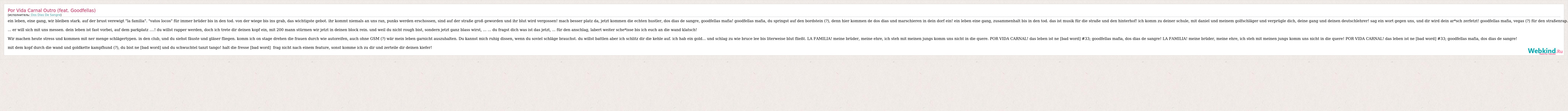 ein leben, eine gang, wir bleiben stark. auf der brust verewigt "la familia". "vatos locos" für immer brüder bis in den tod. von der wiege bis ins grab, das wichtigste gebot. ihr kommt niemals an uns ran, punks werden erschossen, sind auf der straße groß geworden und ihr blut wird vergossen! mach besser platz da, jetzt kommen die echten hustler, dos dias de sangre, goodfellas mafia! goodfellas mafia, du springst auf den bordstein (?), denn hier kommen de dos dias und marschieren in dein dorf ein! ein leben eine gang, zusammenhalt bis in den tod. das ist musik für die straße und den hinterhof! ich komm zu deiner schule, mit daniel und meinem golfschläger und verprügle dich, deine gang und deinen deutschlehrer! sag ein wort gegen uns, und dir wird dein ar*sch zerfetzt! goodfellas mafia, vegas (?) für den straßenrap. ... er will sich mit uns messen. dein leben ist fast vorbei, auf dem parkplatz ....! du willst rapper werden, doch ich trete dir deinen kopf ein, mit 200 mann stürmen wir jetzt in deinen block rein. und weil du nicht rough bist, sondern jetzt ganz blass wirst, ... ... du fragst dich was ist das jetzt, ... für den anschlag, labert weiter sche*isse bis ich euch an die wand klatsch! Wir machen heute stress und kommen mit ner menge schlägertypen. in den club, und du siehst fäuste und gläser fliegen. komm ich on stage drehen die frauen durch wie autoreifen, auch ohne GSM (?) wär mein leben garnicht auszuhalten. Du kannst mich ruhig dissen, wenn du soviel schläge brauchst. du willst battlen aber ich schlitz dir die kehle auf. ich hab ein gold... und schlag zu wie bruce lee bis literweise blut fließt. LA FAMILIA! meine brüder, meine ehre, ich steh mit meinen jungs komm uns nicht in die quere. POR VIDA CARNAL! das leben ist ne [bad word] #33; goodfellas mafia, dos dias de sangre! LA FAMILIA! meine brüder, meine ehre, ich steh mit meinen jungs komm uns nicht in die quere! POR VIDA CARNAL! das leben ist ne [bad word] #33; goodfellas mafia, dos dias de sangre! mit dem kopf durch die wand und goldkette kampfhund (?), du bist ne [bad word] und du schwuchtel tanzt tango! halt die fresse [bad word] frag nicht nach einem feature, sonst komme ich zu dir und zerteile dir deinen kiefer!