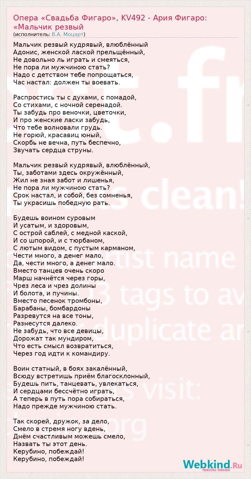 Мальчик резвый кудрявый, влюблённый Адонис, женской лаской прельщённый, Не довольно ль играть и смеяться, Не пора ли мужчиною стать? Надо с детством тебе попрощаться, Час настал: должен ты воевать. Распростись ты с духами, с помадой, Со стихами, с ночной серенадой. Ты забудь про веночки, цветочки, И про женские ласки забудь, Что тебе волновали грудь. Не горюй, красавиц юный, Скорбь не вечна, путь беспечно, Звучать сердца струны. Мальчик резвый кудрявый, влюблённый, Ты, заботами здесь окружённый, Жил не зная забот и лишенья, Не пора ли мужчиною стать? Срок настал, и собой, без сомненья, Ты украсишь победную рать. Будешь воином суровым И усатым, и здоровым, С острой саблей, с медной каской, И со шпорой, и с тюрбаном, С лютым видом, с пустым карманом, Чести много, а денег мало, Да, чести много, а денег мало. Вместо танцев очень скоро Марш начнётся через горы, Чрез леса и чрез долины И болота, и пучины. Вместо песенок тромбоны, Барабаны, бомбардоны Разревутся на все тоны, Разнесутся далеко. Не забудь, что все девицы, Дорожат так мундиром, Что есть смысл возвратиться, Через год идти к командиру. Воин статный, в боях закалённый, Всюду встретишь приём благосклонный, Будешь пить, танцевать, увлекаться, И сердцами бессчётно играть, А теперь в путь пора собираться, Надо прежде мужчиною стать. Так скорей, дружок, за дело, Смело в стремя ногу вдень, Днём счастливым можешь смело, Назвать ты этот день. Керубино, побеждай! Керубино, побеждай!