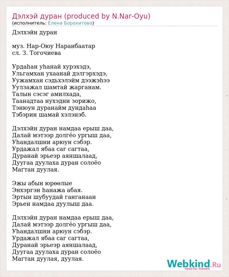 Дэлхэйн дуран муз. Нар-Оюу Наранбаатар сл. З. Тогочиева Урдаhан уhанай хурэхэдэ, Ульгамхан ухаанай дэлгэрхэдэ, Уужамхан сэдьхэлэйм дээжэhээ Уулзажал шамтай жарганам. Талын сэсэг амилхада, Таанадтаа нухэдни зорижо, Тэнюун дуранайм дундаhаа Тэбэрин шамай хэлэнэб. Дэлхэйн дуран намдаа ерыш даа, Далай мэтээр долгёо ургыш даа, Уhандалшни арюун сэбэр. Урдажал ябаа саг сагтаа, Дуранай эрьеэр аяншалаад, Дуугаа дуулаха дуран солоёо Магтан дуулая. Эжы абын юрөөлые Энхэргэн hанажа абая. Эртын шубуудай ганганаан Эрьен намдаа дуулыш даа. Дэлхэйн дуран намдаа ерыш даа, Далай мэтээр долгёо ургыш даа, Уhандалшни арюун сэбэр. Урдажал ябаа саг сагтаа, Дуранай эрьеэр аяншалаад, Дуугаа дуулаха дуран солоёо Магтан дуулая, дуулая.