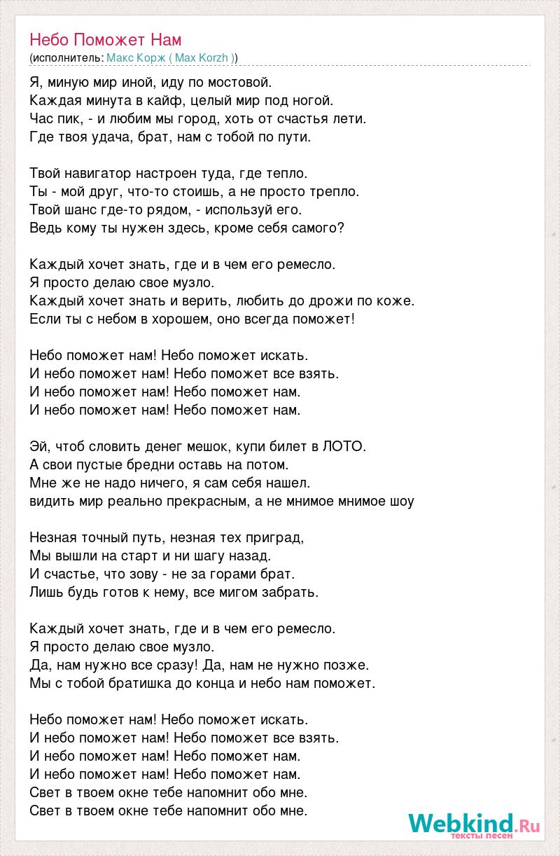 Я, миную мир иной, иду по мостовой. Каждая минута в кайф, целый мир под ногой. Час пик, - и любим мы город, хоть от счастья лети. Где твоя удача, брат, нам с тобой по пути. Твой навигатор настроен туда, где тепло. Ты - мой друг, что-то стоишь, а не просто трепло. Твой шанс где-то рядом, - используй его. Ведь кому ты нужен здесь, кроме себя самого? Каждый хочет знать, где и в чем его ремесло. Я просто делаю свое музло. Каждый хочет знать и верить, любить до дрожи по коже. Если ты с небом в хорошем, оно всегда поможет! Небо поможет нам! Небо поможет искать. И небо поможет нам! Небо поможет все взять. И небо поможет нам! Небо поможет нам. И небо поможет нам! Небо поможет нам. Эй, чтоб словить денег мешок, купи билет в ЛОТО. А свои пустые бредни оставь на потом. Мне же не надо ничего, я сам себя нашел. видить мир реально прекрасным, а не мнимое мнимое шоу Незная точный путь, незная тех приград, Мы вышли на старт и ни шагу назад. И счастье, что зову - не за горами брат. Лишь будь готов к нему, все мигом забрать. Каждый хочет знать, где и в чем его ремесло. Я просто делаю свое музло. Да, нам нужно все сразу! Да, нам не нужно позже. Мы с тобой братишка до конца и небо нам поможет. Небо поможет нам! Небо поможет искать. И небо поможет нам! Небо поможет все взять. И небо поможет нам! Небо поможет нам. И небо поможет нам! Небо поможет нам. Свет в твоем окне тебе напомнит обо мне. Свет в твоем окне тебе напомнит обо мне.