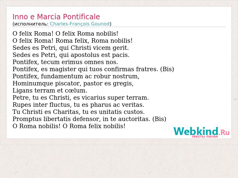 O felix Roma! O felix Roma nobilis! O felix Roma! Roma felix, Roma nobilis! Sedes es Petri, qui Christi vicem gerit. Sedes es Petri, qui apostolus est pacis. Pontifex, tecum erimus omnes nos. Pontifex, es magister qui tuos confirmas fratres. (Bis) Pontifex, fundamentum ac robur nostrum, Hominumque piscator, pastor es gregis, Ligans terram et cœlum. Petre, tu es Christi, es vicarius super terram. Rupes inter fluctus, tu es pharus ac veritas. Tu Christi es Charitas, tu es unitatis custos. Promptus libertatis defensor, in te auctoritas. (Bis) O Roma nobilis! O Roma felix nobilis!
